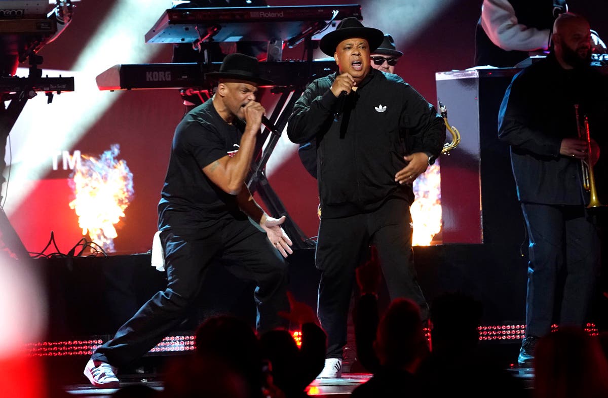 Run DMC performs "King of Rock" at the 65th annual Grammy Awards on Sunday. (AP Photo/Chris Pizzello)
