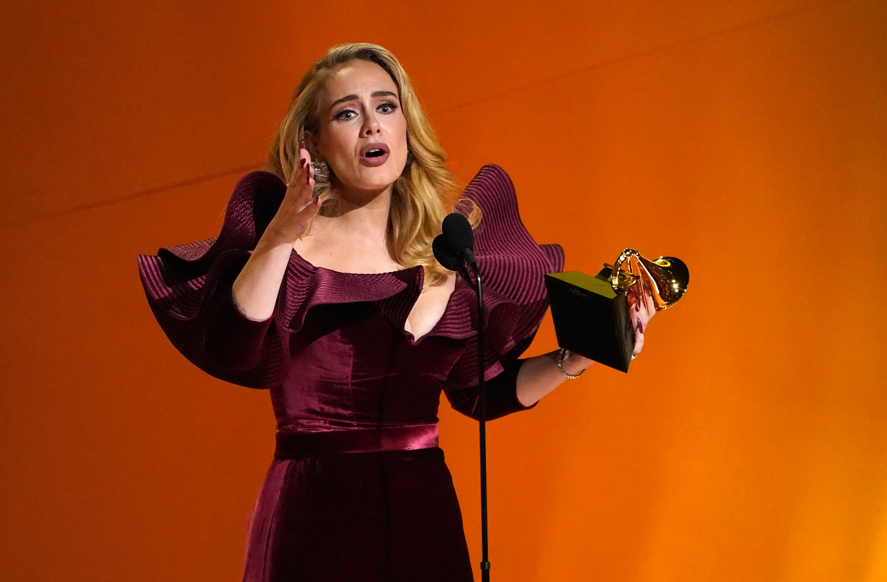 Adele accepts the award for best pop solo performance for "Easy On Me" at the 65th annual Grammy Awards. (AP Photo/Chris PizzelloBrandi Carlile's Performance Brandi Carlile performs on stage at the 65th annual Grammy Awards. (AP Photo/Chris Pizzello)Bold Red Carpet Looks