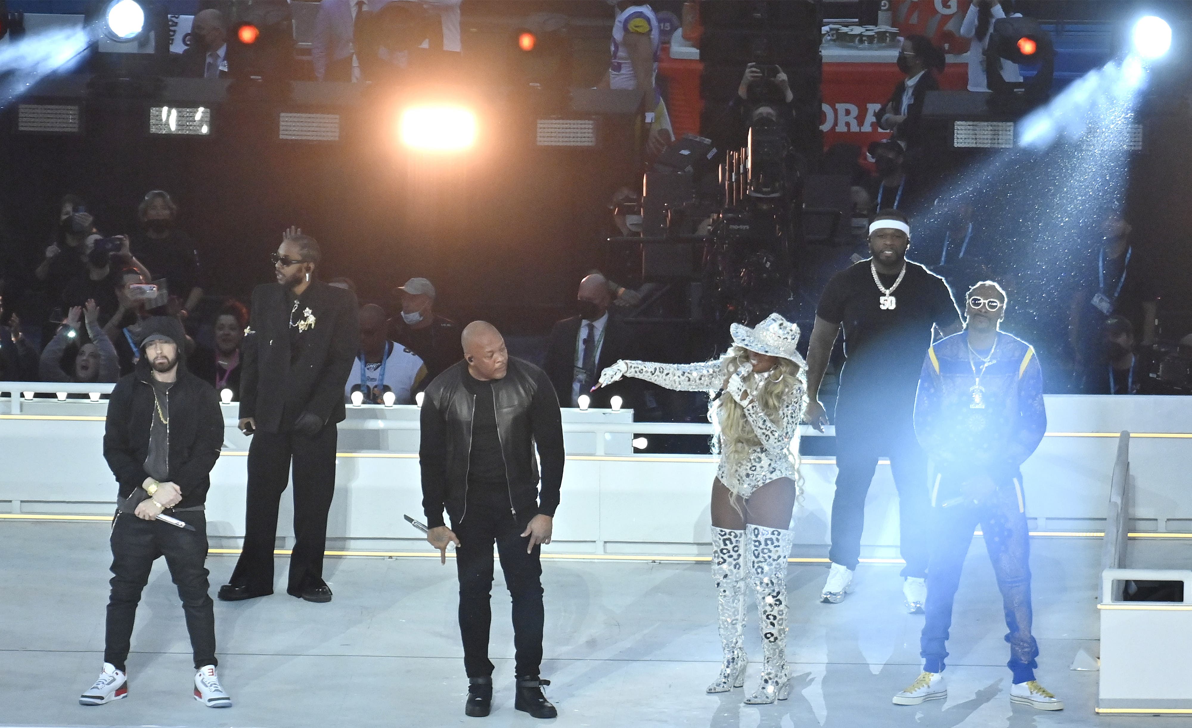 See photos of the 2022 Super Bowl halftime show featuring Eminem, Dr. Dre, Mary J. Blige, Snoop Dogg and Kendrick Lamar.