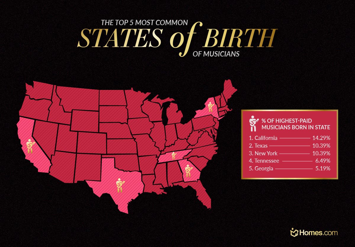 Is it fair to say that almost everyone has wanted to be a rockstar once upon a time? The Nickelback song might have something to it, but it’s likely in the south where the best chances of fame lie. Over 25% of the highest paid celebrities over the last few years have been musicians, and 1 in 5 of those musicians come from cities in Georgia, Tennessee, and Texas. Although 14% of the highest paid musicians are native to the Golden State, country musicians and residents of the southeast have the highest chance of celebrity status.
