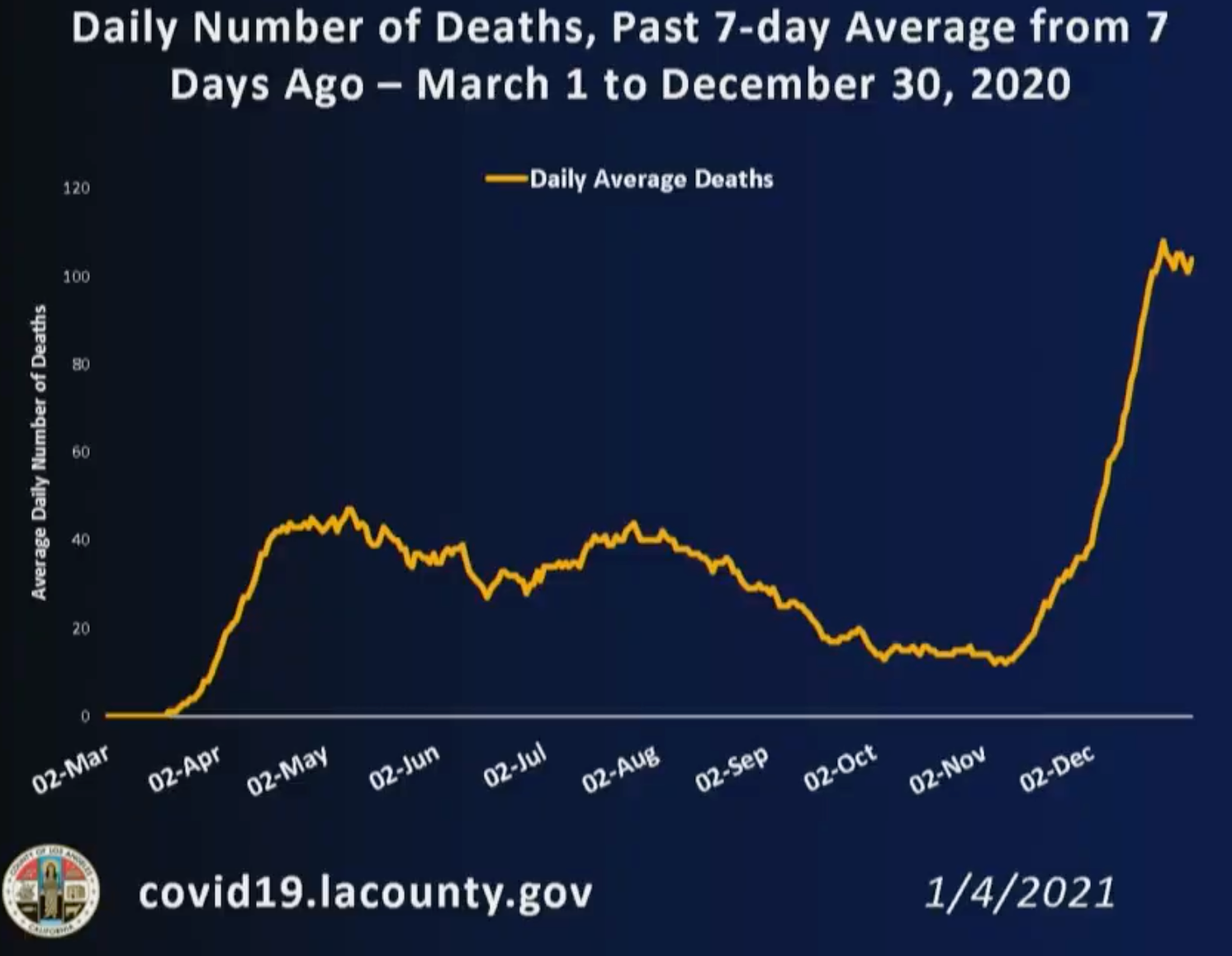 While the number of those dying remained in the double digits just in November, the daily death toll has begun surpassing 100 almost daily, County Public Health Director Barbara Ferrer said. Ferrer said the county could be barreling toward a fate where hundreds, if not thousands, could die each day if Angelenos don't begin to heed health orders soon.