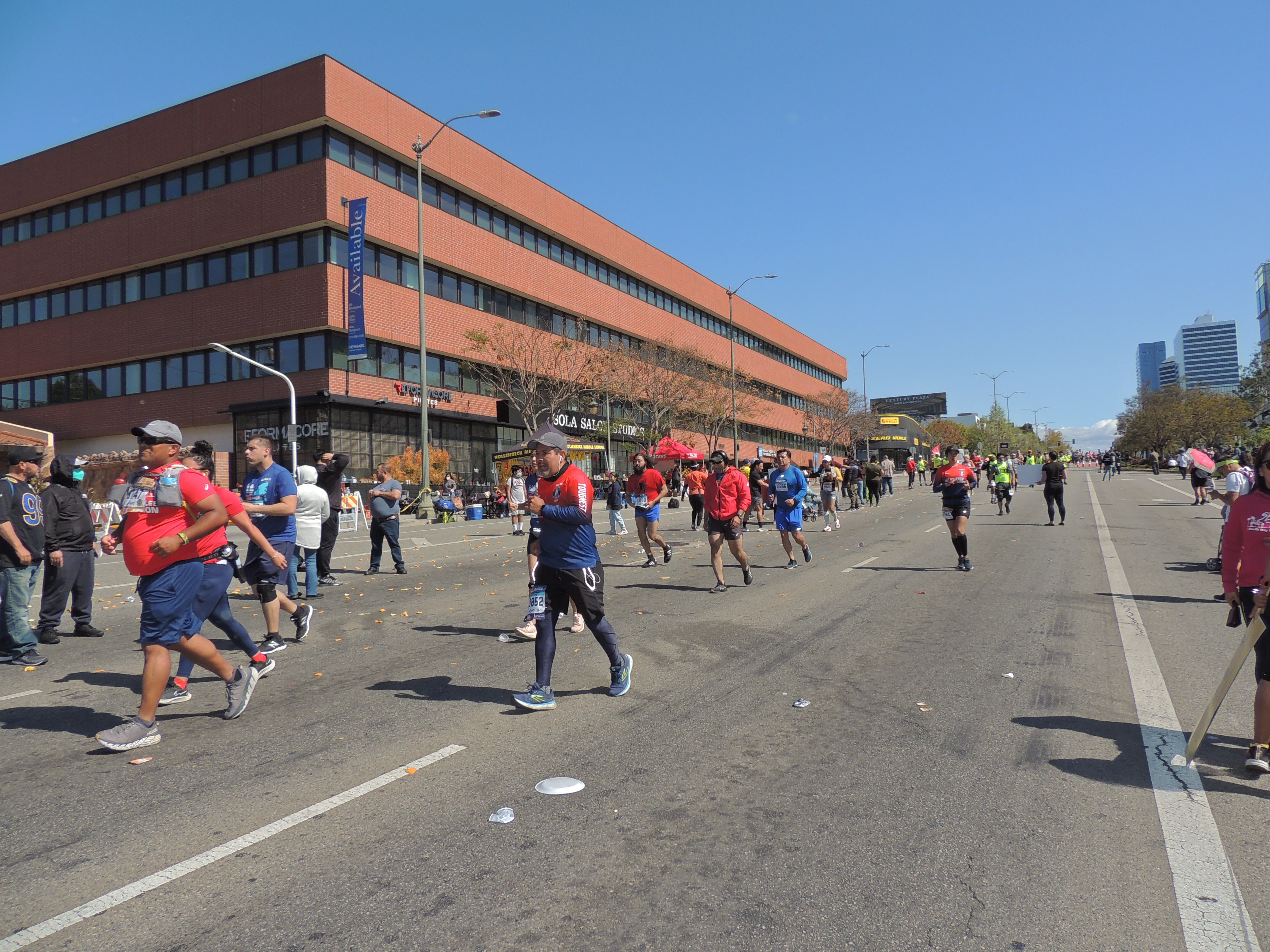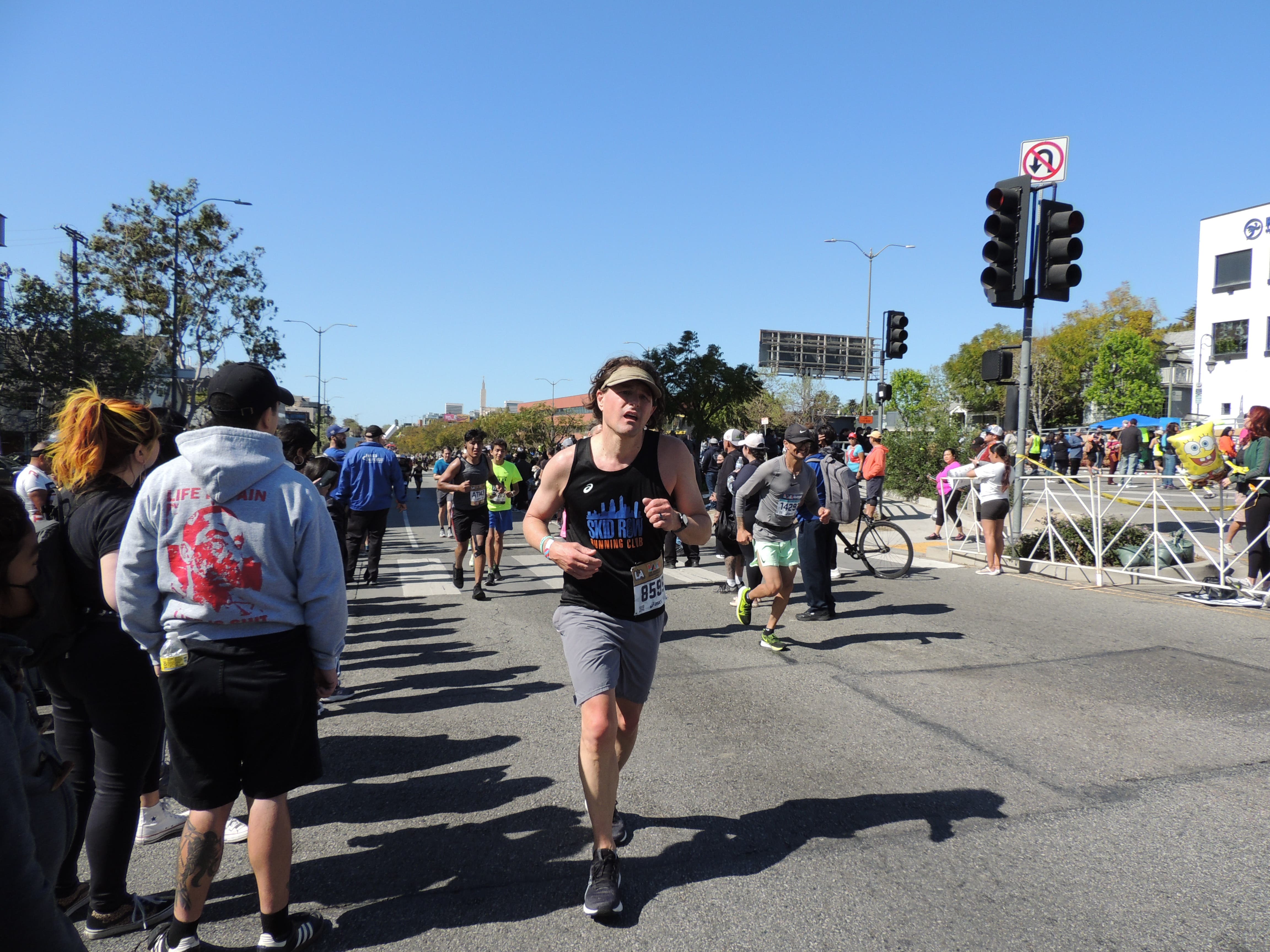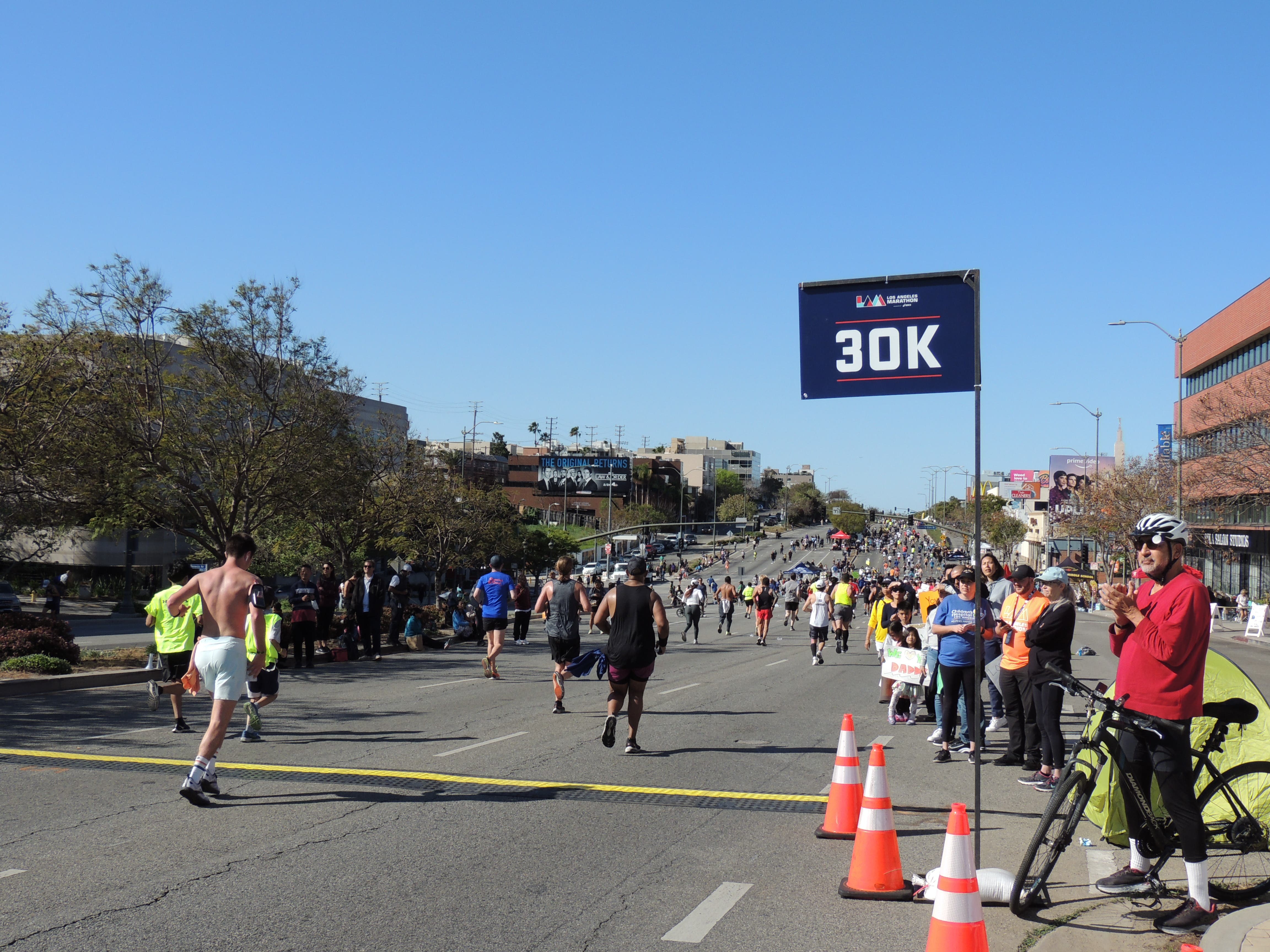 From Dodger Stadium, runners headed through downtown Los Angeles, Echo Park, Hollywood, West Hollywood, Beverly Hills, Century City, Westwood and Brentwood then back through Westwood to Century City, where temperatures warmed up into the low 70s by noon.