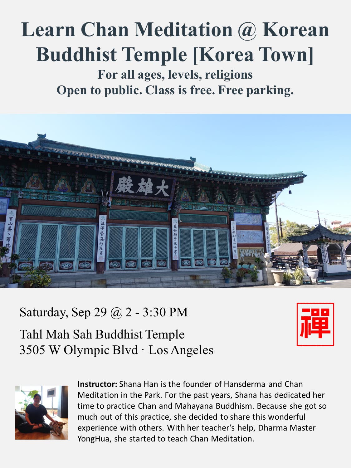 [Korea Town] Saturday, September 29, 2018 from 2:00 PM to 3:30 PM @ Tahl Mah Sah Buddhist Temple 3505 W Olympic Blvd · Los Angeles. Click to RSVP or drop-ins (FREE Parking on promise)