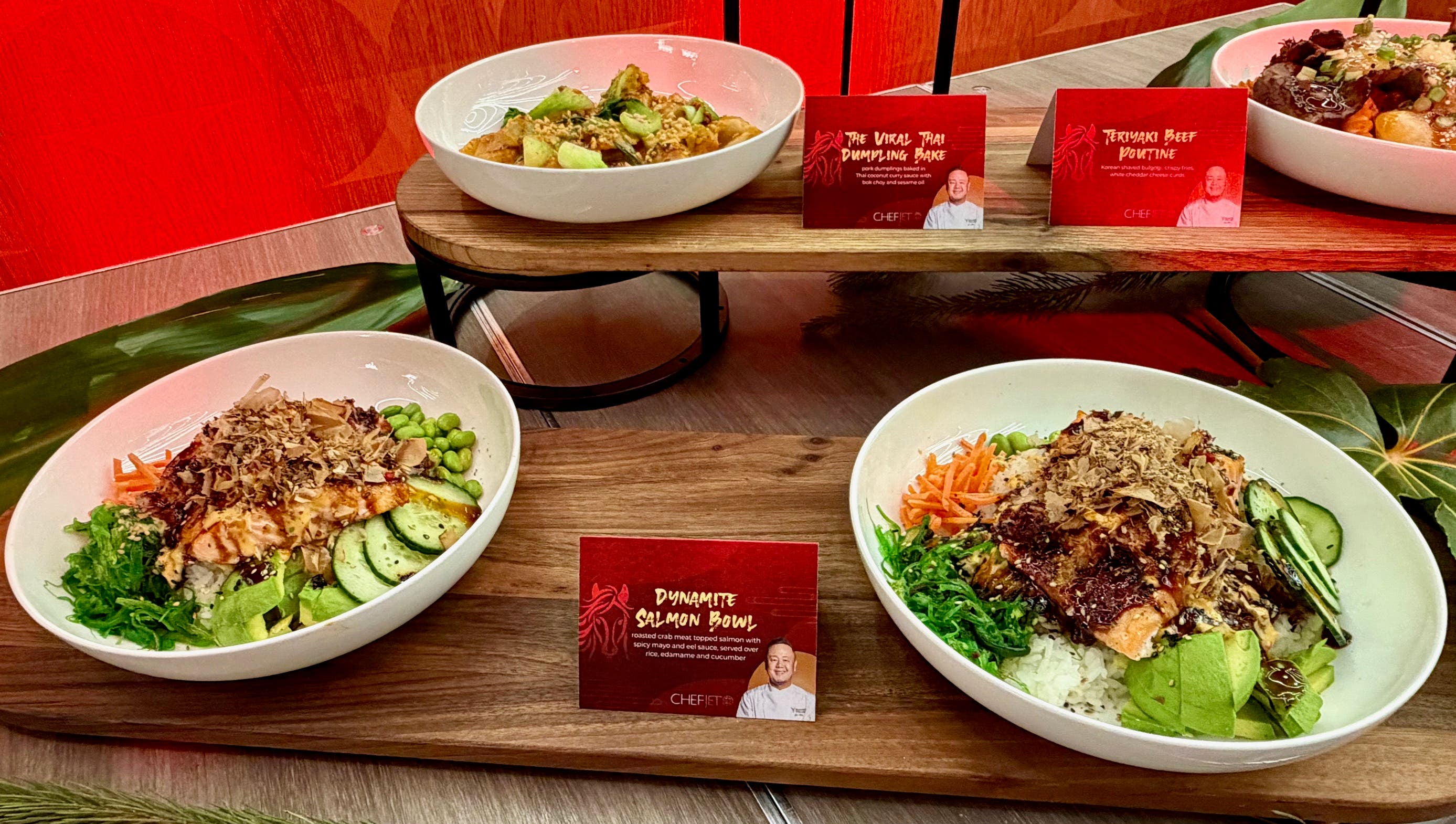 Now through March 31, 2026, Jet Tila’s menu at bEATS includes The Viral Thai Dumpling Bake – Chicken dumplings baked in Thai coconut curry sauce with wok chop and sesame oil. There is also a Dynamite Salmon Bowl made with roasted crab meat topped salmon with spicy mayo and eel sauce. It’s served over rice, with edamame and cucumber slices.