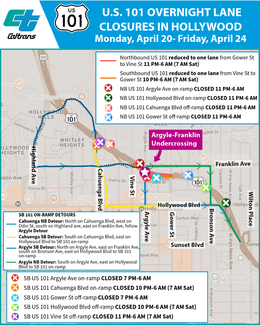 - Hollywood Boulevard on-ramp closed from 11 p.m. to 6 a.m.