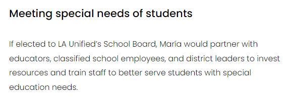 There are about 64,500 students in the district with special education needs enrolled in the LAUSD, and Brenes dedicated only 218 characters toward what she would do to meet their needs. However, these words tell families everything they need to know about the candidate; while “educators, classified school employees, and district leaders” will have a seat at the table, parents are not even mentioned. If she had bothered to reach out before publishing this page she would know that the problems with the delivery of special education services are hampered by much more than how resources are invested or how the staff is trained but rather that the entire system is badly broken. Rocio Rivas was willing to detail her ideas on fixing the system, which leaves the question as to why isn’t Brenes able to do the same.