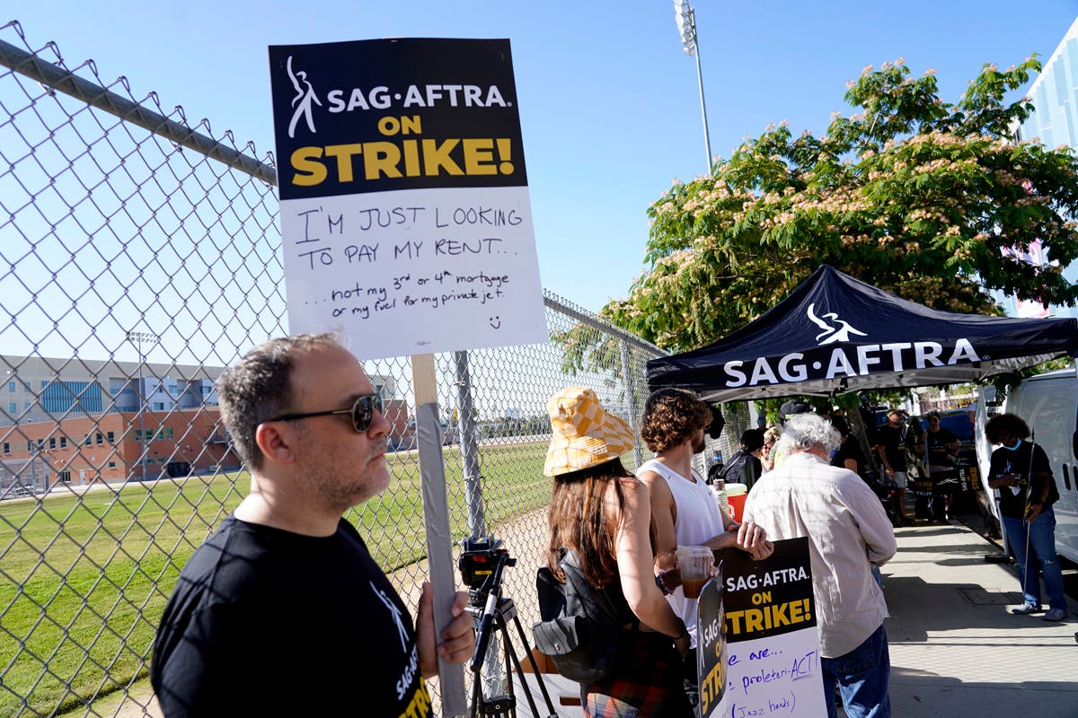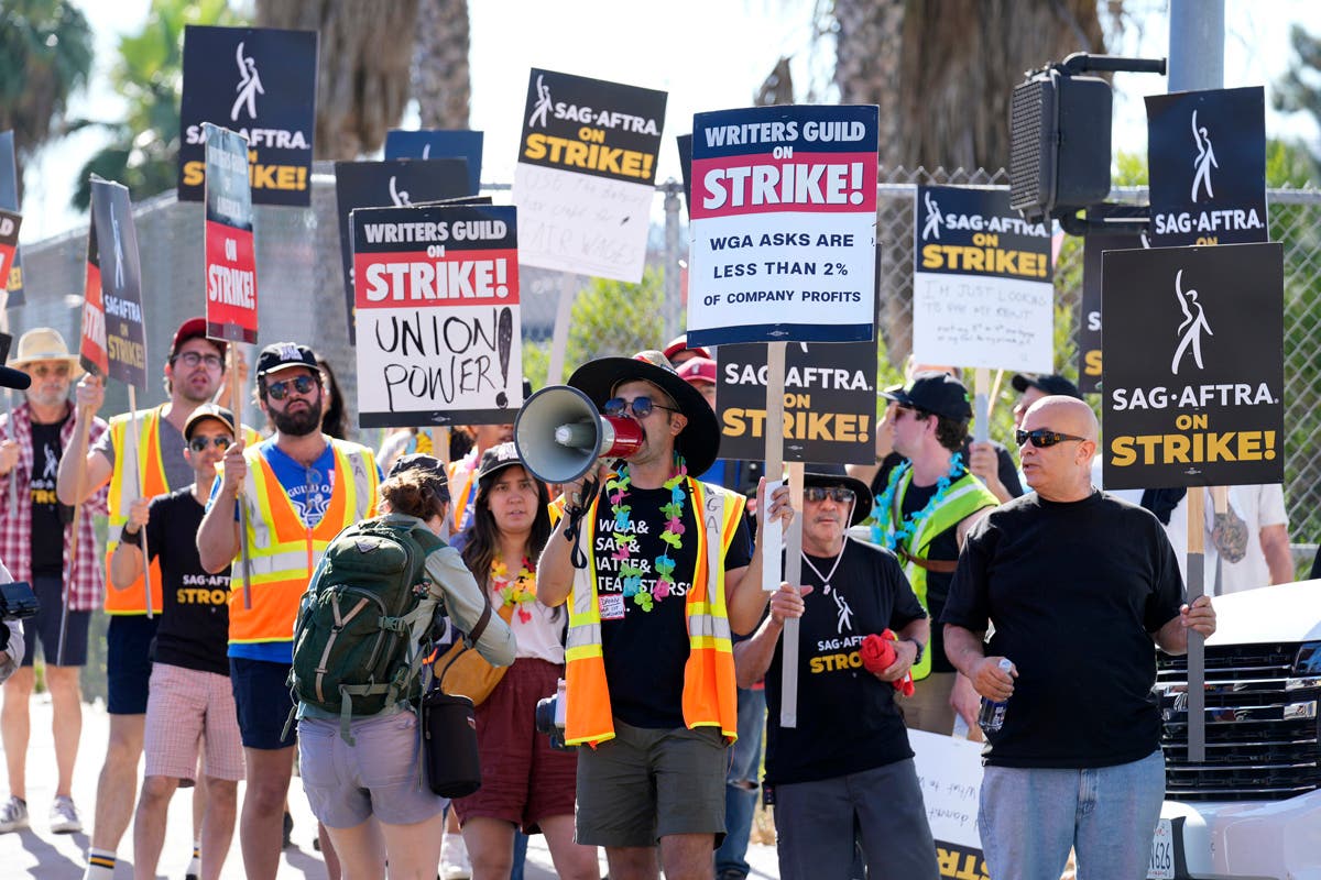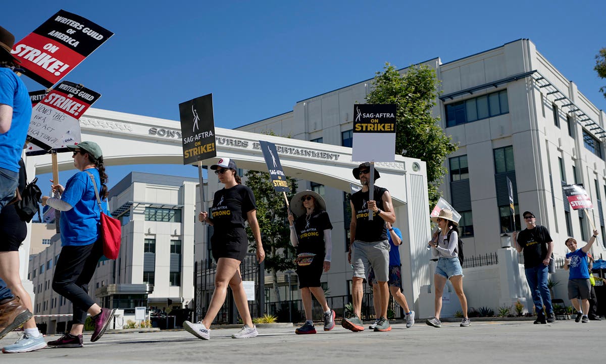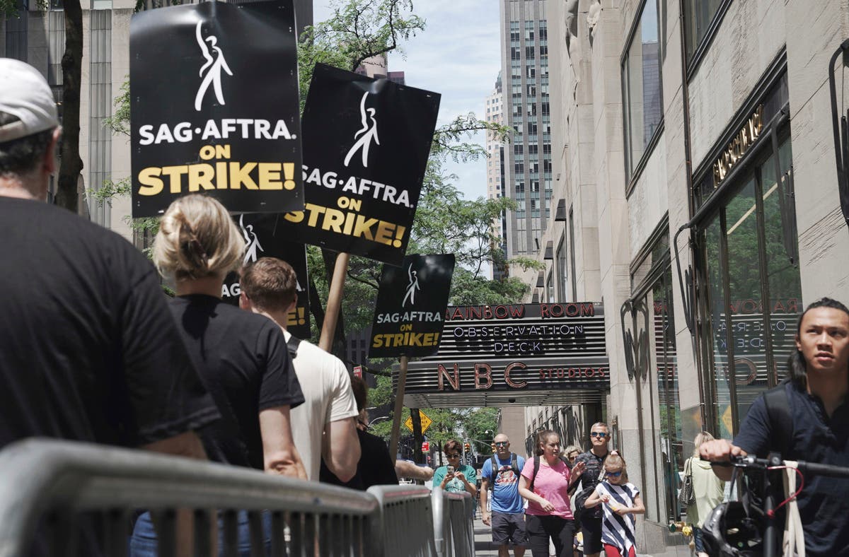 Writers and actors join forces as they walk the picket line during a strike, Friday, July 14, 2023, at NBC Universal Studios in New York. (AP Photo/Bebeto Matthews)Striking writers and actors take part in a rally outside Netflix studio in Los Angeles on Friday, July 14, 2023. (AP Photo/Chris Pizzello)Striking writers and actors take part in a "Bastille Day: Let Them Eat Croissants" rally outside Sony Pictures studio in Culver City, Calif. on Friday, July 14, 2023. (AP Photo/Mark J. Terrill)Writers and actors join forces as they walk the picket line during a strike, Friday, July 14, 2023, at NBC Universal Studios in New York. (AP Photo/Bebeto Matthews)Next SAG-AFTRA member Chris Paseka takes part in a rally by striking writers and actors outside Netflix studio in Los Angeles on Friday, July 14, 2023. (AP Photo/Chris Pizzello)Actor Joely Fisher, from left, SAG-AFTRA president Fran Drescher and Duncan Crabtree-Ireland, SAG-AFTRA national executive director and chief negotiator, take part in a rally by striking writers and actors outside Netflix studio in Los Angeles on Friday, July 14, 2023\. (AP Photo/Chris Pizzello)Striking writers and actors take part in a rally outside Netflix studio in Los Angeles on Friday, July 14, 2023. (AP Photo/Chris Pizzello)Striking writers and actors take part in a rally outside Netflix studio in Los Angeles on Friday, July 14, 2023. (AP Photo/Chris Pizzello)Writers and actors walk the picket line during a strike, Friday, July 14, 2023, at NBC Universal Studios in New York. (AP Photo/Bebeto Matthews)Striking writers and actors take part in a "Bastille Day: Let Them Eat Croissants" rally outside Sony Pictures studio in Culver City, California on Friday, July 14, 2023. (AP Photo/Mark J. Terrill)Actor Dermot Mulroney takes part in a rally by striking writers and actors outside Netflix studio in Los Angeles on Friday, July 14, 2023. (AP Photo/Chris Pizzello)Striking writers and actors take part in a rally outside Sunset Bronson studios in Los Angeles on Friday, July 14, 2023. (AP Photo/Chris Pizzello)Striking writers and actors take part in a "Bastille Day: Let Them Eat Croissants" rally outside Sony Pictures studio in Culver City, California on Friday, July 14, 2023. (AP Photo/Mark J. Terrill)Actor Jason Sudeikis, center, walk a picket line with striking writers and actors, Friday, July 14, 2023 at NBC Universal Studios in New York. (AP Photo/Bebeto Matthews)
