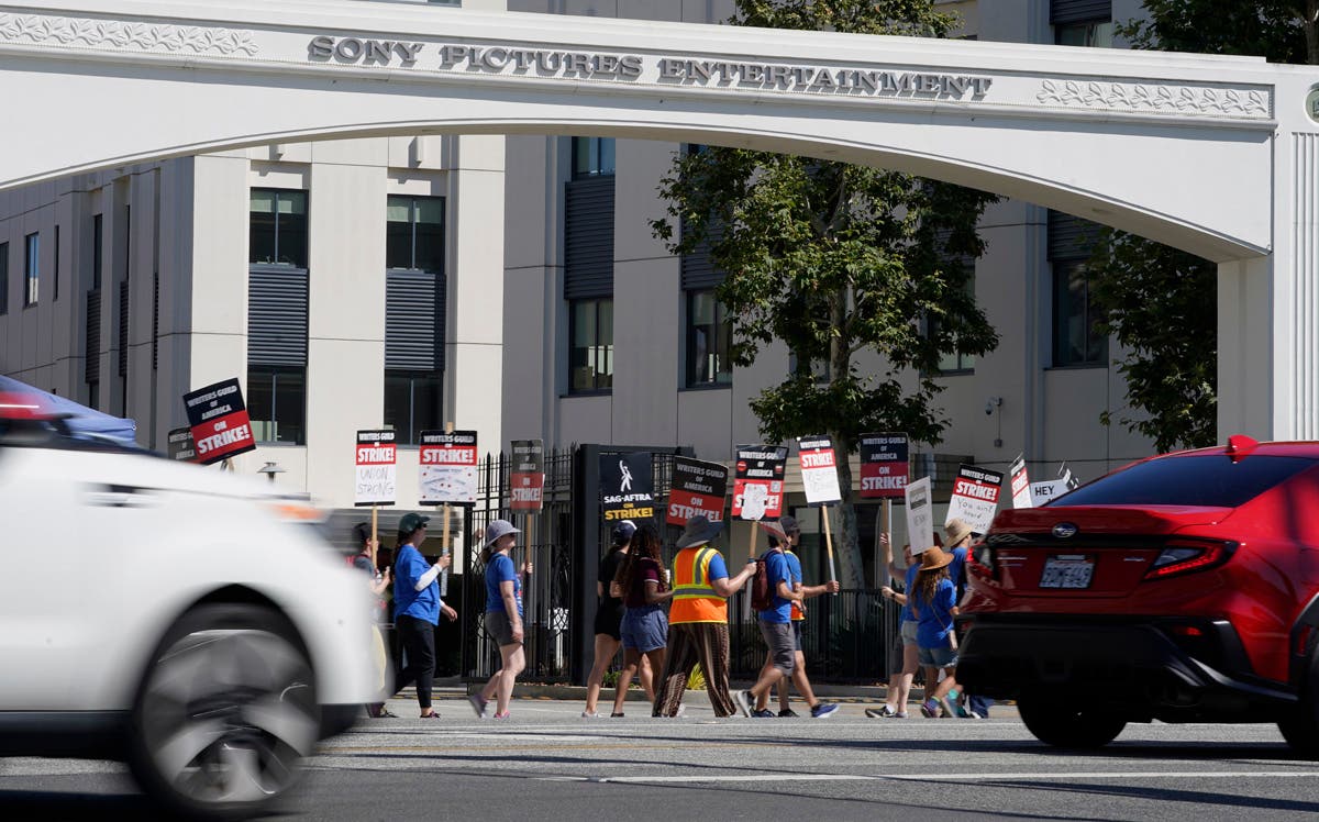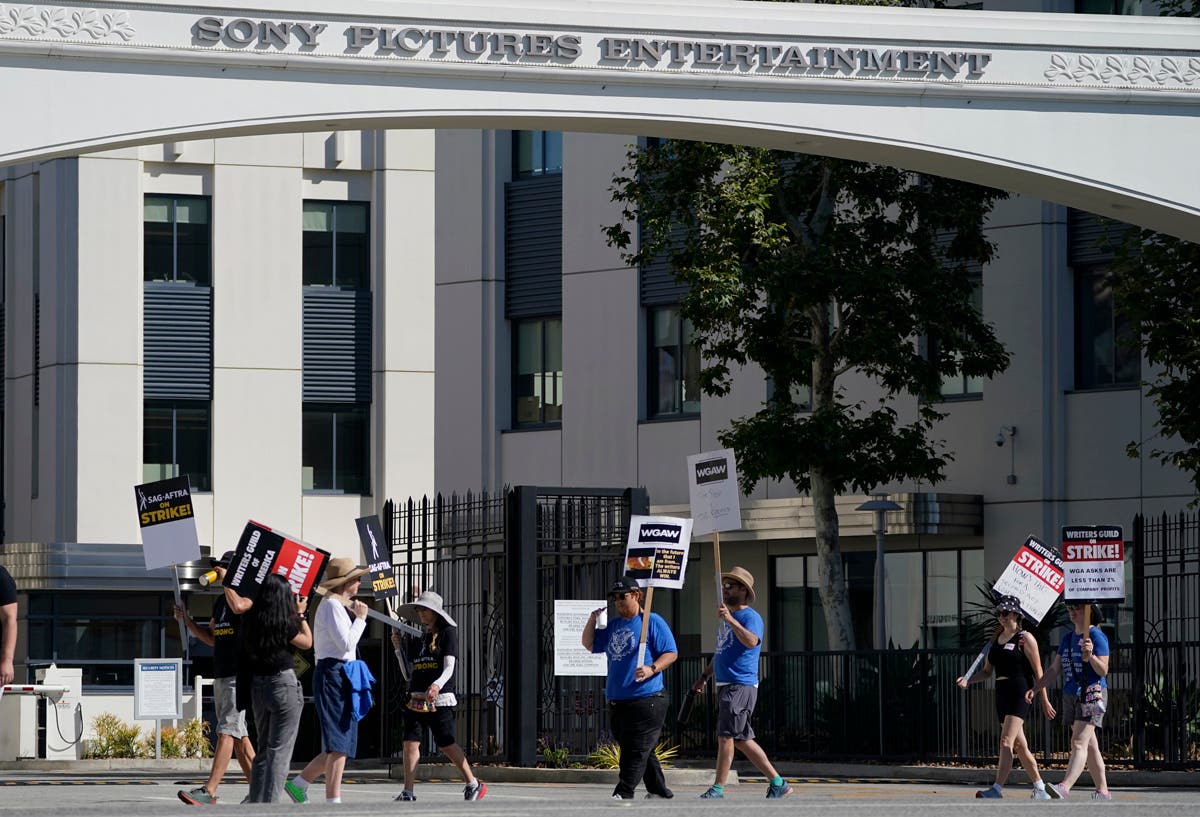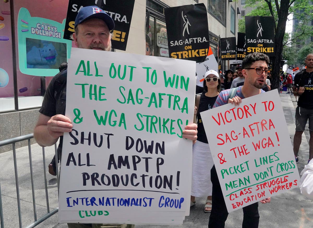 Writers and actors join forces as they walk the picket line during a strike, Friday, July 14, 2023, at NBC Universal Studios in New York. (AP Photo/Bebeto Matthews)Striking writers and actors take part in a rally outside Netflix studio in Los Angeles on Friday, July 14, 2023. (AP Photo/Chris Pizzello)Striking writers and actors take part in a "Bastille Day: Let Them Eat Croissants" rally outside Sony Pictures studio in Culver City, Calif. on Friday, July 14, 2023. (AP Photo/Mark J. Terrill)Writers and actors join forces as they walk the picket line during a strike, Friday, July 14, 2023, at NBC Universal Studios in New York. (AP Photo/Bebeto Matthews)Next SAG-AFTRA member Chris Paseka takes part in a rally by striking writers and actors outside Netflix studio in Los Angeles on Friday, July 14, 2023. (AP Photo/Chris Pizzello)Actor Joely Fisher, from left, SAG-AFTRA president Fran Drescher and Duncan Crabtree-Ireland, SAG-AFTRA national executive director and chief negotiator, take part in a rally by striking writers and actors outside Netflix studio in Los Angeles on Friday, July 14, 2023\. (AP Photo/Chris Pizzello)Striking writers and actors take part in a rally outside Netflix studio in Los Angeles on Friday, July 14, 2023. (AP Photo/Chris Pizzello)Striking writers and actors take part in a rally outside Netflix studio in Los Angeles on Friday, July 14, 2023. (AP Photo/Chris Pizzello)Writers and actors walk the picket line during a strike, Friday, July 14, 2023, at NBC Universal Studios in New York. (AP Photo/Bebeto Matthews)Striking writers and actors take part in a "Bastille Day: Let Them Eat Croissants" rally outside Sony Pictures studio in Culver City, California on Friday, July 14, 2023. (AP Photo/Mark J. Terrill)Actor Dermot Mulroney takes part in a rally by striking writers and actors outside Netflix studio in Los Angeles on Friday, July 14, 2023. (AP Photo/Chris Pizzello)Striking writers and actors take part in a rally outside Sunset Bronson studios in Los Angeles on Friday, July 14, 2023. (AP Photo/Chris Pizzello)Striking writers and actors take part in a "Bastille Day: Let Them Eat Croissants" rally outside Sony Pictures studio in Culver City, California on Friday, July 14, 2023. (AP Photo/Mark J. Terrill)Actor Jason Sudeikis, center, walk a picket line with striking writers and actors, Friday, July 14, 2023 at NBC Universal Studios in New York. (AP Photo/Bebeto Matthews)