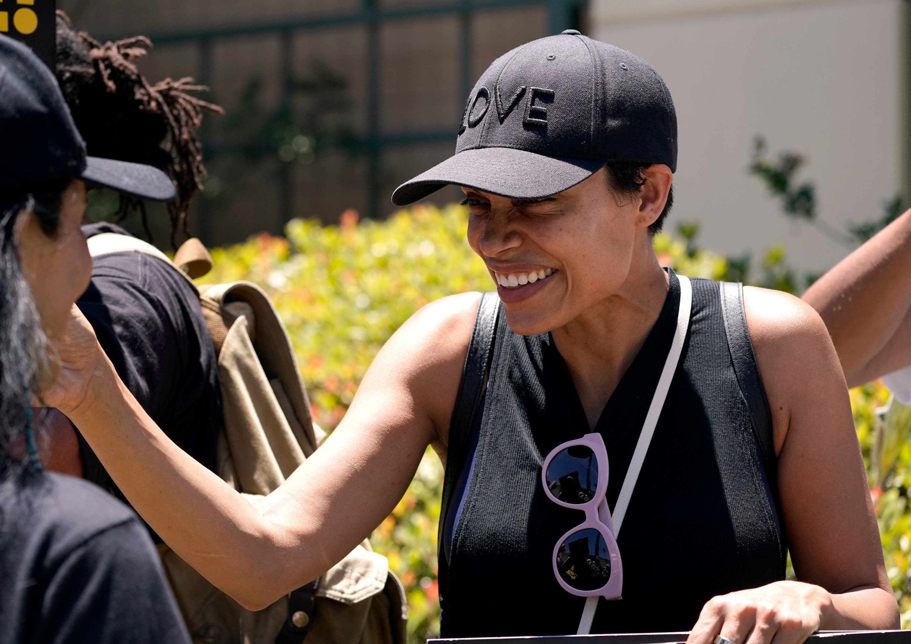 Actor Rosario Dawson attends a rally by striking writers and actors outside Warner Bros. studios in Burbank, Calif. on Friday, July 14, 2023. This marks the first day actors formally joined the picket lines, more than two months after screenwriters began striking in their bid to get better pay and working conditions and have clear guidelines around the use of AI in film and television productions.(AP Photo/Mark J. Terrill)