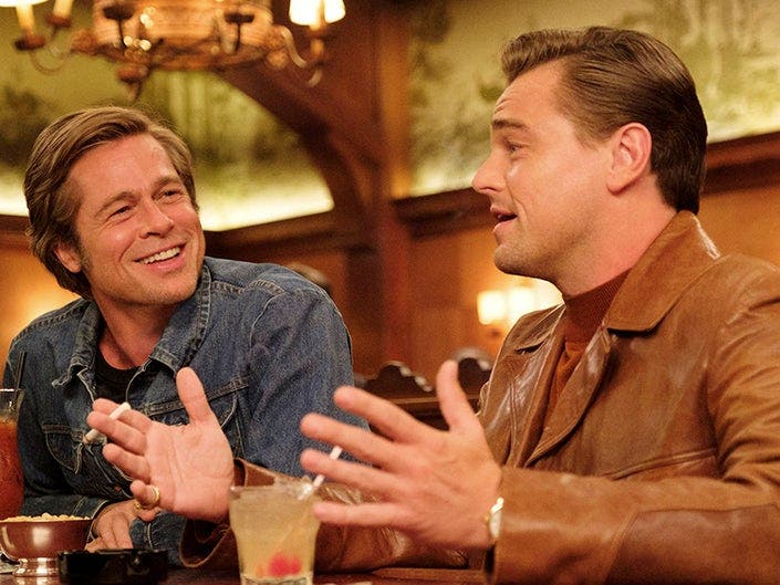 It is February 1969 in Los Angeles. Western TV series star Rick Dalton, portrayed by Leonardo DiCaprio, is driven around by his best friend and stunt double Cliff Booth, played by Brad Pitt, who has trouble finding work because rumor has it that he killed his wife.