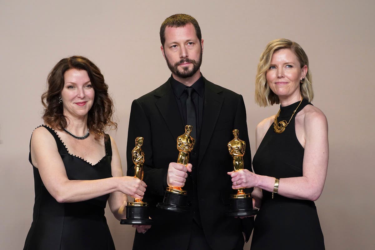 Jessica Lange, left, and Emma Stone appear during the Oscars on Sunday, March 10, 2024, at the Dolby Theatre in Los Angeles. (AP Photo/Chris Pizzello)Da'Vine Joy Randolph accepts the award for best performance by an actress in a supporting role for "The Holdovers" during the Oscars on Sunday, March 10, 2024, at the Dolby Theatre in Los Angeles. (AP Photo/Chris Pizzello)Robert Downey Jr. accepts the award for best performance by an actor in a supporting role for "Oppenheimer" during the Oscars on Sunday, March 10, 2024, at the Dolby Theatre in Los Angeles. (AP Photo/Chris Pizzello)Raney Aronson-Rath, from left, Vasilisa Stepanenko, Mstyslav Chernov, Evgeniy Maloletka, Michelle Mizner, and Derl McCrudden accept the award for best documentary feature film for "20 Days in Mariupol" during the Oscars on Sunday, March 10, 2024, at the Dolby Theatre in Los Angeles. (AP Photo/Chris Pizzello)Christopher Nolan poses in the press room with the awards for best director and best picture for "Oppenheimer" at the Oscars on Sunday, March 10, 2024, at the Dolby Theatre in Los Angeles. Emma Thomas, winner of the award for best picture for "Oppenheimer," looks on from the right. (Photo by Jordan Strauss/Invision/AP)Robert Downey Jr., left, and Emily Blunt appear in the audience during the Oscars on Sunday, March 10, 2024, at the Dolby Theatre in Los Angeles. (AP Photo/Chris Pizzello)Messi the dog from the film "Anatomy of a Fall" appears in the audience during the Oscars on Sunday, March 10, 2024, at the Dolby Theatre in Los Angeles. (AP Photo/Chris Pizzello)Finneas, left, and Billie Eilish perform "What Was I Made For?" from "Barbie" during the Oscars on Sunday, March 10, 2024, at the Dolby Theatre in Los Angeles. (AP Photo/Chris Pizzello)Christopher Nolan, winner of the awards for best director and best picture for "Oppenheimer," left, and Emma Thomas, winner of the award for best picture for "Oppenheimer" pose at the Governors Ball after the Oscars on Sunday, March 10, 2024, at the Dolby Theatre in Los Angeles. (AP Photo/John Locher)Robert Downey Jr., winner of the award for best performance by an actor in a supporting role for "Oppenheimer," from left, Da'Vine Joy Randolph, winner of the award for best performance by an actress in a supporting role for "The Holdovers," Emma Stone, winner of the award for best performance by an actress in a leading role for "Poor Things," and Cillian Murphy, winner of the award for best performance by an actor in a leading role for "Oppenheimer," pose in the press room at the Oscars on Sunday, March 10, 2024, at the Dolby Theatre in Los Angeles. (Photo by Jordan Strauss/Invision/AP)Raney Aronson-Rath, from left, Mstyslav Chernov, and Michelle Mizner pose in the press room with the award for best documentary feature film for "20 Days in Mariupol" at the Oscars on Sunday, March 10, 2024, at the Dolby Theatre in Los Angeles. (Photo by Jordan Strauss/Invision/AP)Matteo Bocelli, left, and Andrea Bocelli perform "Time to say Goodbye" during an in memoriam segment of the Oscars on Sunday, March 10, 2024, at the Dolby Theatre in Los Angeles. (AP Photo/Chris Pizzello)Jimmy Kimmel speaks during the Oscars on Sunday, March 10, 2024, at the Dolby Theatre in Los Angeles. (AP Photo/Chris Pizzello)