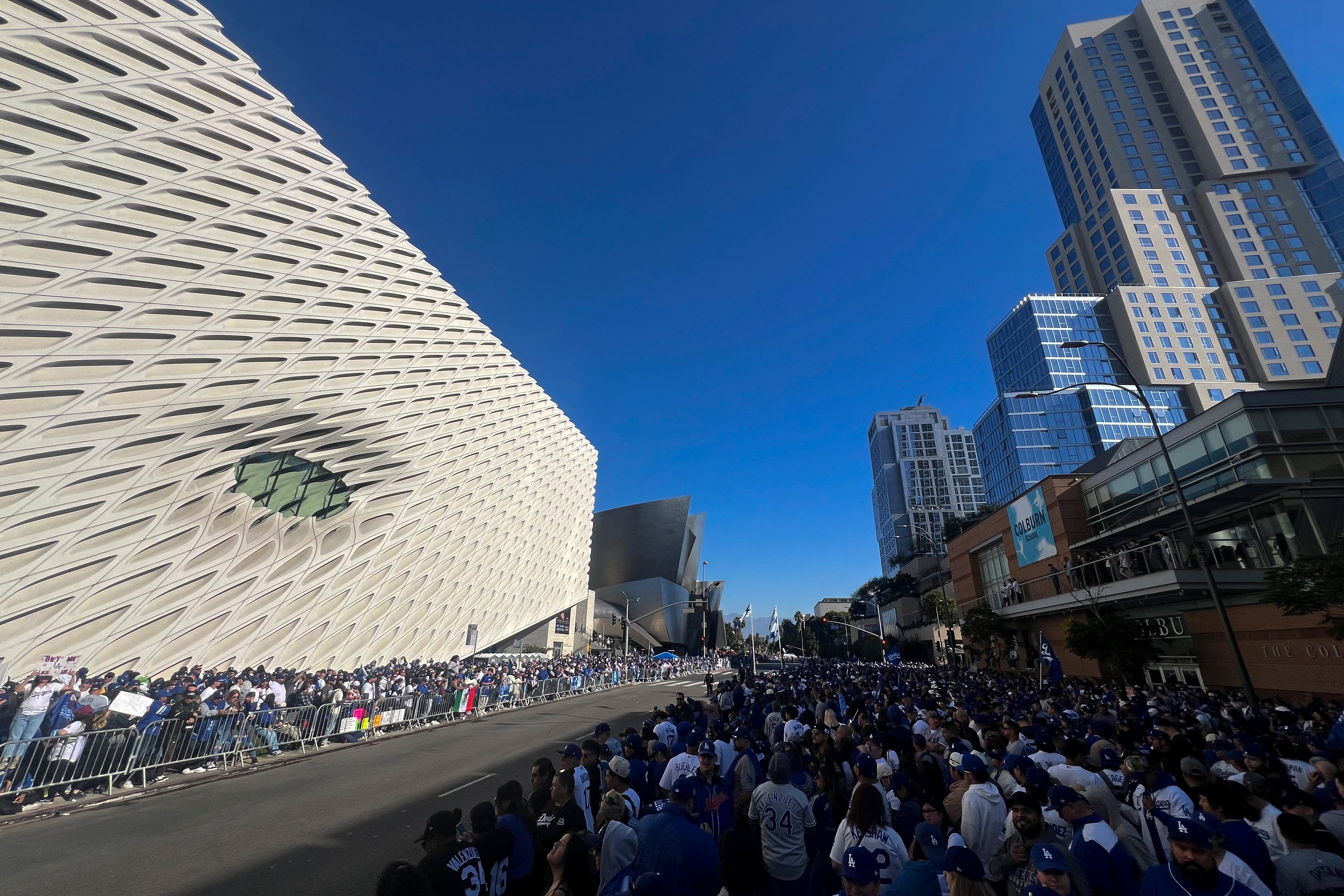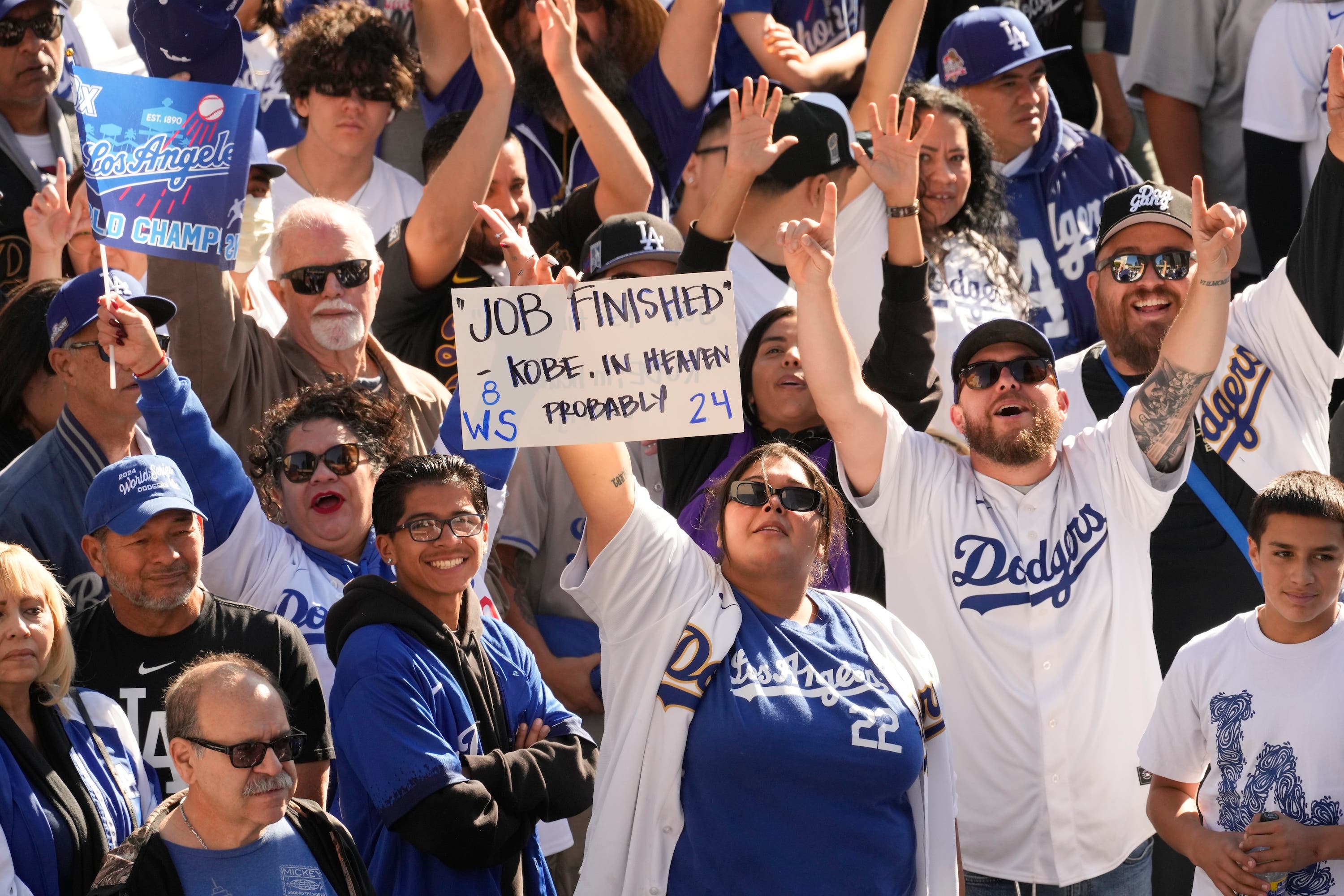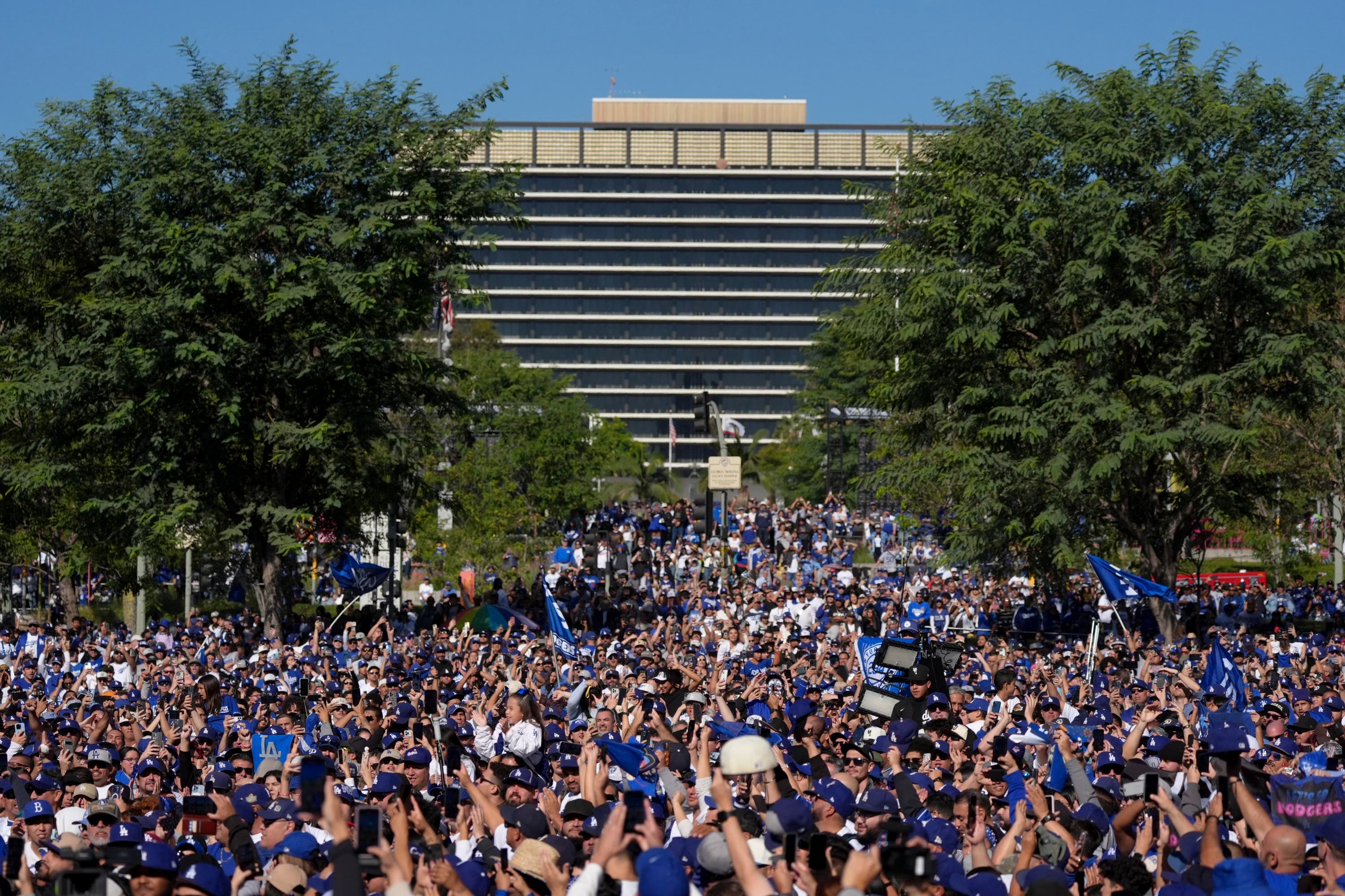 Fans cheer as buses carrying players are driven past during the Los Angeles Dodgers baseball World Series championship parade Friday, November 1, 2024, in Los Angeles. (AP Photo/Jae C. Hong) Fans line up the Los Angeles Dodgers players who won the World Series during the parade in Los Angeles on Friday, November 1, 2024.(AP Photo/Jae C. Hong)Los Angeles Dodgers' Alex Vesia yells in celebration during the Los Angeles Dodgers baseball World Series championship parade Friday, Nov. 1, 2024, in Los Angeles. (AP Photo/Jae C. Hong)Los Angeles Dodgers' Mookie Betts waves at fans during the Los Angeles Dodgers baseball World Series championship parade Friday, Nov. 1, 2024, in Los Angeles. (AP Photo/Jae C. Hong)Fans cheer before the Los Angeles Dodgers baseball World Series championship parade Friday, November 1, 2024, in Los Angeles. (AP Photo/Jae C. Hong)Fans crowd the sidewalks as they await the start of the Los Angeles Dodgers baseball World Series championship parade Friday, November 1, 2024, in Los Angeles. (AP Photo/Damian Dovarganes)Fans cheer and hold signs before the Los Angeles Dodgers baseball World Series championship parade Friday, November 1, 2024, in Los Angeles. (AP Photo/Damian Dovarganes)Dodgers fans attend the victory parade in Los Angeles. (John Salangsang/Shutterstock)Fans crowd behind barricades waiting for the start of the Los Angeles Dodgers baseball World Series championship parade Friday, November 1, 2024, in Los Angeles. (AP Photo/Kyusung Gong)Fans crowd the sidewalk as they wait for the start of the Los Angeles Dodgers baseball World Series championship parade Friday, November 1, 2024, in Los Angeles. (AP Photo/Kyusung Gong)A fan holds a replica trophy during the Los Angeles Dodgers baseball World Series championship parade Friday, November 1, 2024, in Los Angeles. (AP Photo/Kyusung Gong)Los Angeles City Hall glows in Dodger Blue to celebrate the Dodgers' World Series Championship in Los Angeles on Thursday, October 31, 2024. (AP Photo/Damian Dovarganes)The Los Angeles Dodgers pose for a team picture after their win against the New York Yankees in Game 5 to win the baseball World Series, Thursday, October 31, 2024, in New York. (AP Photo/Ashley Landis)