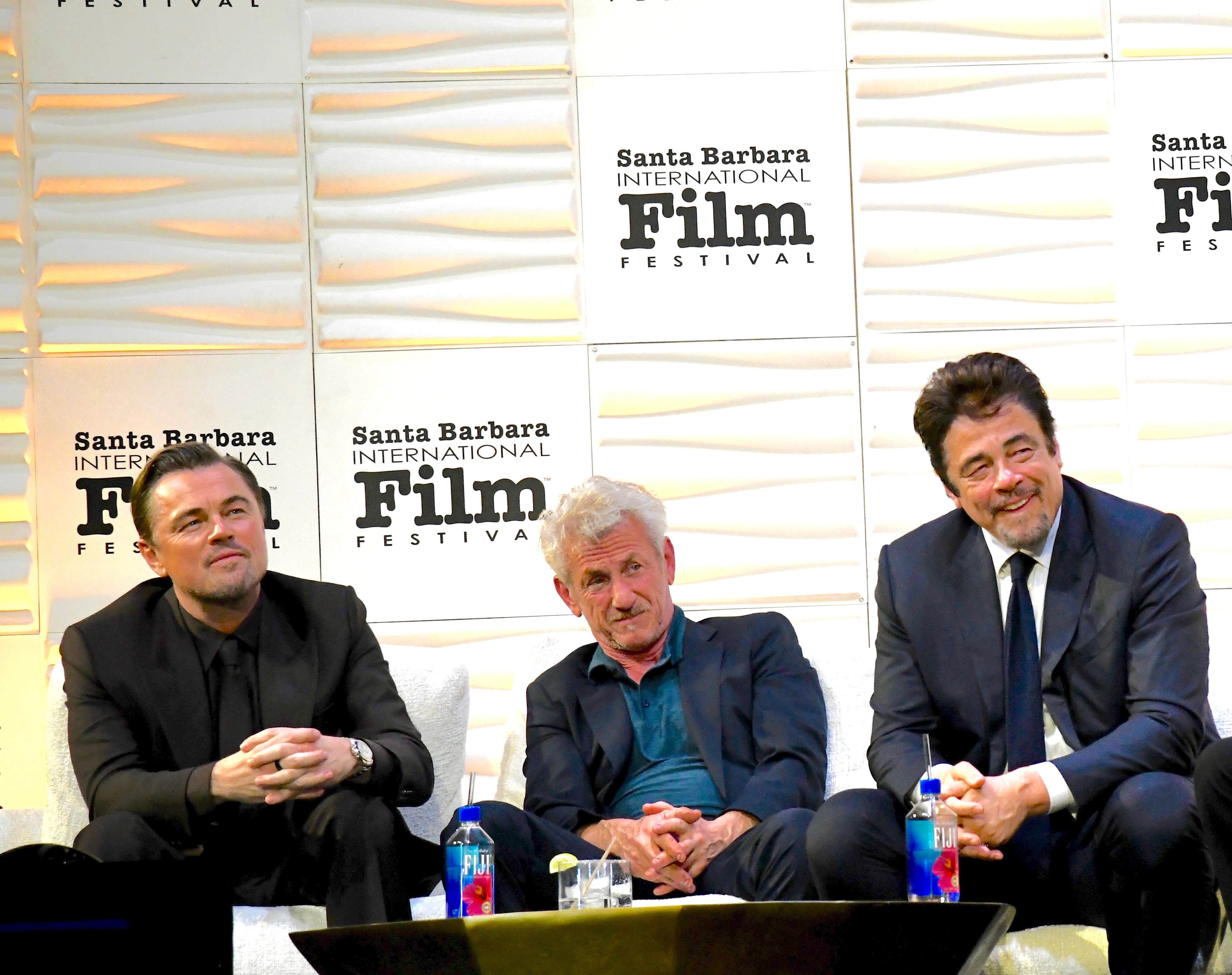 (L-R) Honorees Leonardo DiCaprio, Sean Penn and Benicio del Toro speak onstage at the Hammond Cinema Vanguard Award ceremony during the 41st Santa Barbara International Film Festival at The Arlington Theatre on February 9, 2026 in Santa Barbara, California. (Jonathan Shensa/Patch Media)