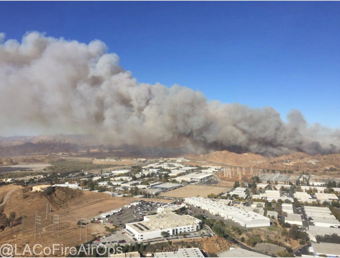 The Fire broke out at 9:35 a.m. near the 2500 block of Rye Canyon Loop, near highway 126, also known as Newhall Ranch Road, according to the Los Angeles County Fire Department. Hundreds of firefighters, including air units, were working to extinguish the fire, which by about 3 p.m. was 5 percent contained and burning in light to medium fuels amid gusting Santa Ana winds.