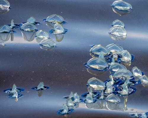 What looks like one of these little creatures is actually a colony of hundreds of polyps that come together to form the By-the-Wind Sailors, according to Nona Reimer of Dana Wharf Sportfishing and Whale Watching. The organisms feed on algae and zooplankton in the water and are commonly eaten by ocean sunfish.