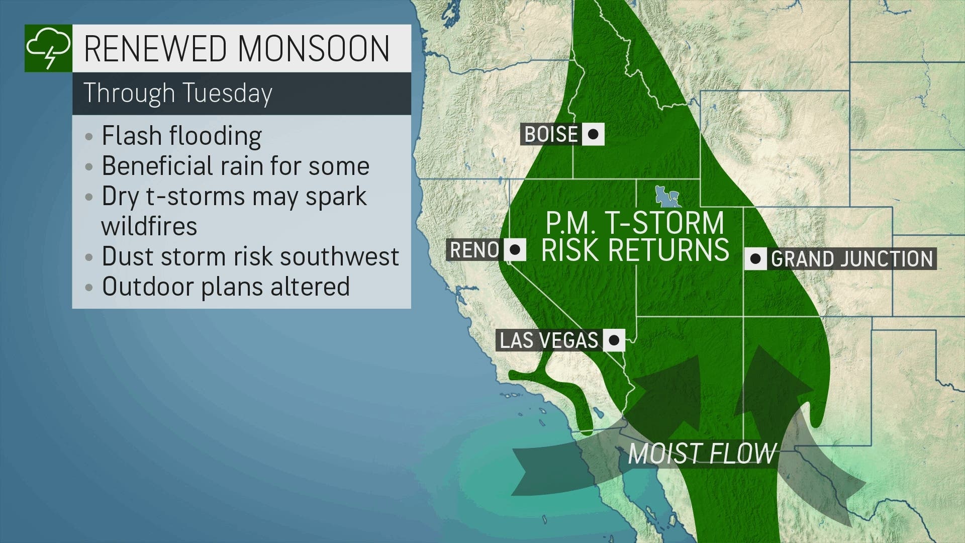 Weather forecasters predicted unsettled weather would continue through the evening Monday, bringing a chance of thunderstorms to the mountains of Southern California before returning to normal on Tuesday.