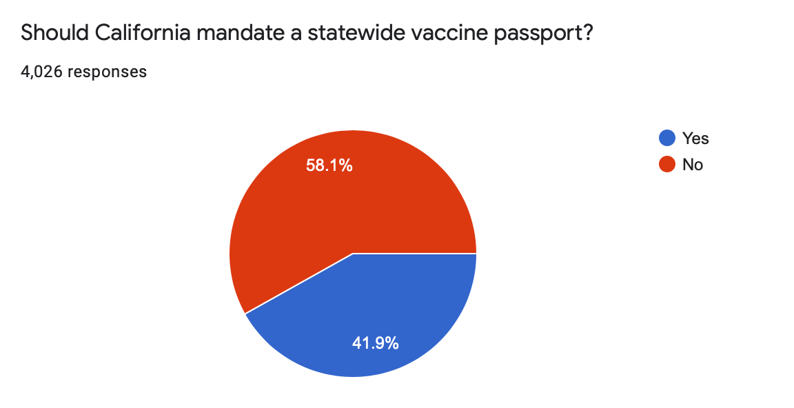 In the recent non-scientific survey, 58.1 percent said they were against California mandating a statewide vaccine passport. Nearly 42 percent said yes, California should mandate the passport.