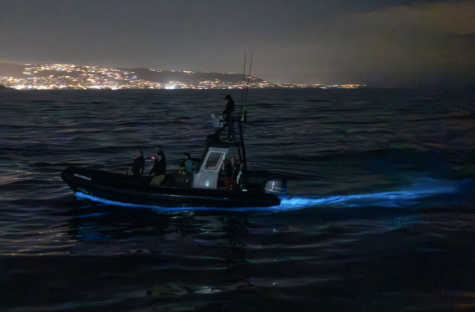 According to Jessica Roame, education & communications manager for Newport Whales in Newport Beach, bioluminescence is caused by tiny phytoplankton called dinoflagellates, which are light-producing organisms that live in the ocean. Dubbed red tide because they van make the ocean look red in the daylight, when the plankton glow in the date when they are agitated by waves or splashing in the water.
