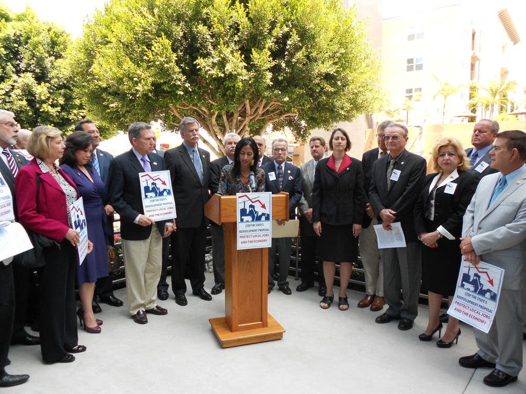 Ceremoniously gathered at the heart of an urban core built on redevelopment funds, city leaders from across Southern California stood on the steps of the Long Beach police headquarters Thursday to oppose the state in its effort to divert tax revenue from city redevelopment programs.