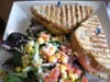 Johnny here! I ordered the Goat Cheese Turkey Panini on Crema’s own homemade bread with Crema’s signature salad. This is my favorite sandwich at Crema. It’s sliced smoked turkey, sweet caramelized onions, tangy goat cheese, fresh and sun dried tomatoes, and a garlic aioli. Now come on, how can that be bad? The combination of ingredients allow for a very flavorful experience. And let’s talk about the Crema signature salad for a moment. I adore this salad. It combines fresh mixed greens, tomatoes, and corn all tossed together with a sherry vinaigrette dressing. It’s colorful, fun, healthy, and delicious along side pretty much anything on the lunch menu. You also have the option of French fries or even sweet potato fries.
