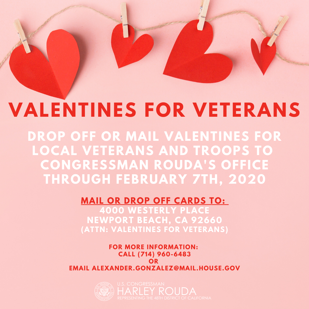 Orange County congressman Harley Rouda's office is collecting valentines for veterans by Friday, Feb. 7.