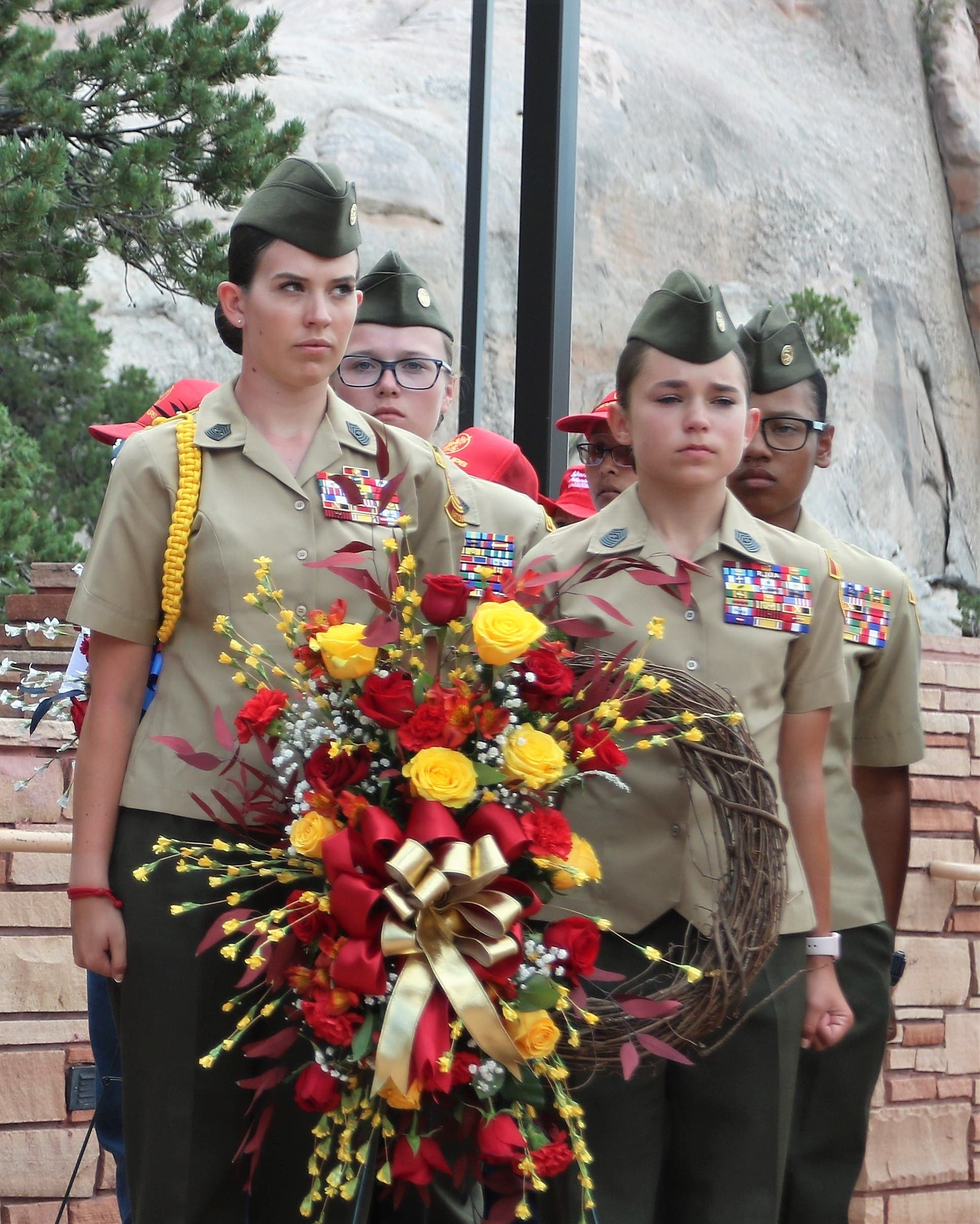The Young Marines participate for three days on the Navajo reservation. They escort the Navajo Code Talkers during Navajo Code Talker Day also participate in a parade, a trail run and clean up, community service at a zoo, and museum education. It is a jammed-packed three days of education and service.