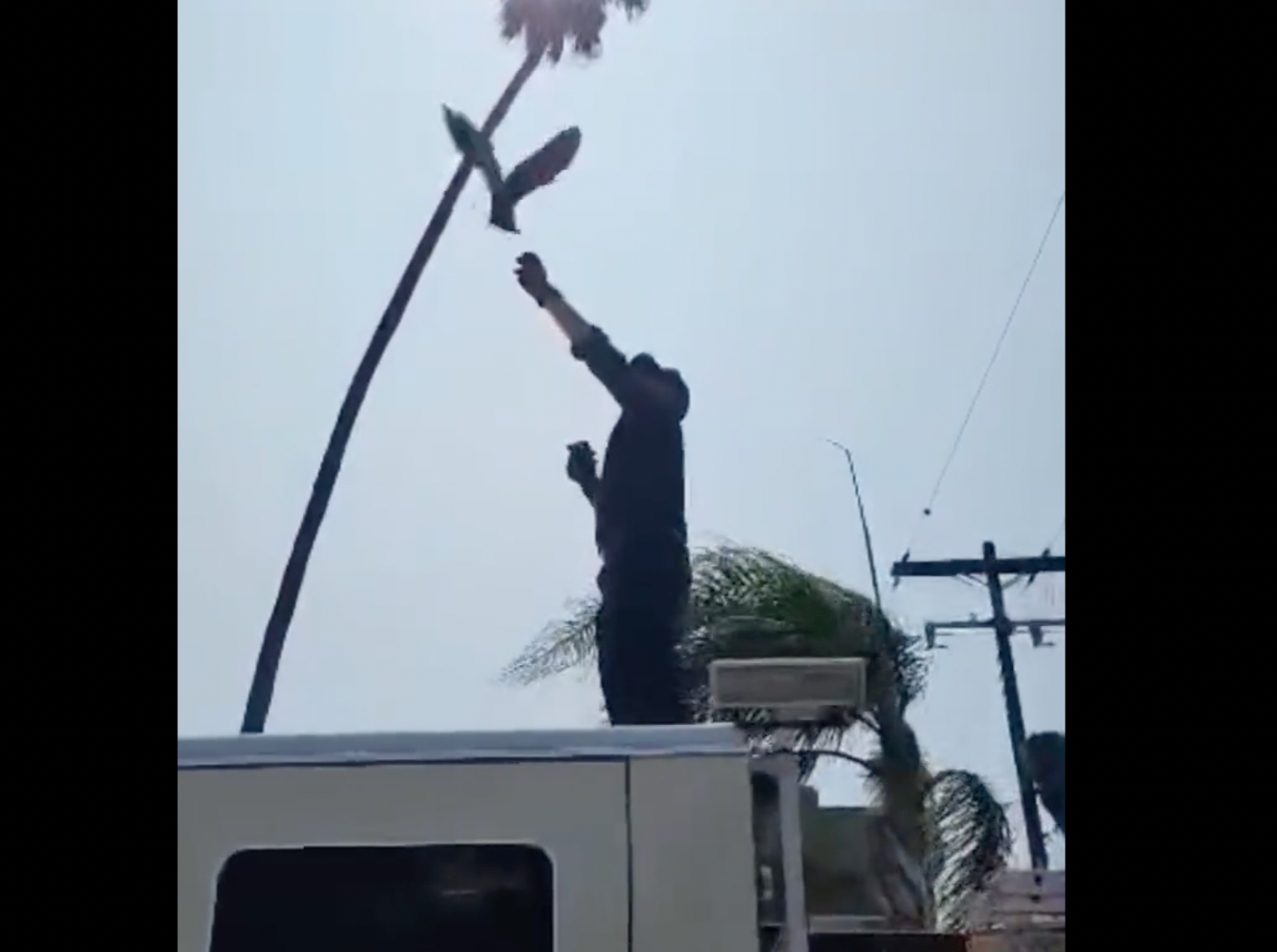 Firefighters received word of the crow in distress when Seal Beach residents spotted the bird hanging upside down from a palm tree in a local neighborhood.