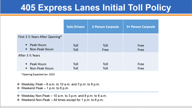 The 405 Express Lanes portion of the project is being modeled after the successful 91 Express Lanes, owned and operated by OCTA. With the 405 Express Lanes, solo drivers will have the choice to pay a toll to speed up their commute. Carpools of two or more people can use the 405 Express Lanes for free for the first 3 ½ years after opening. Cars with three or more people will use the express lanes for free at all times.