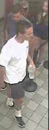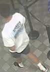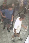 The photos describe the two suspects as two males 15 to 20 years old, with both wearing a white T-shirt and dark shorts. A third suspect, also a male 15 to 20 years old, wearing a dark T-shirt, dark shorts wearing a baseball cap with a Bass Pro Shops logo.