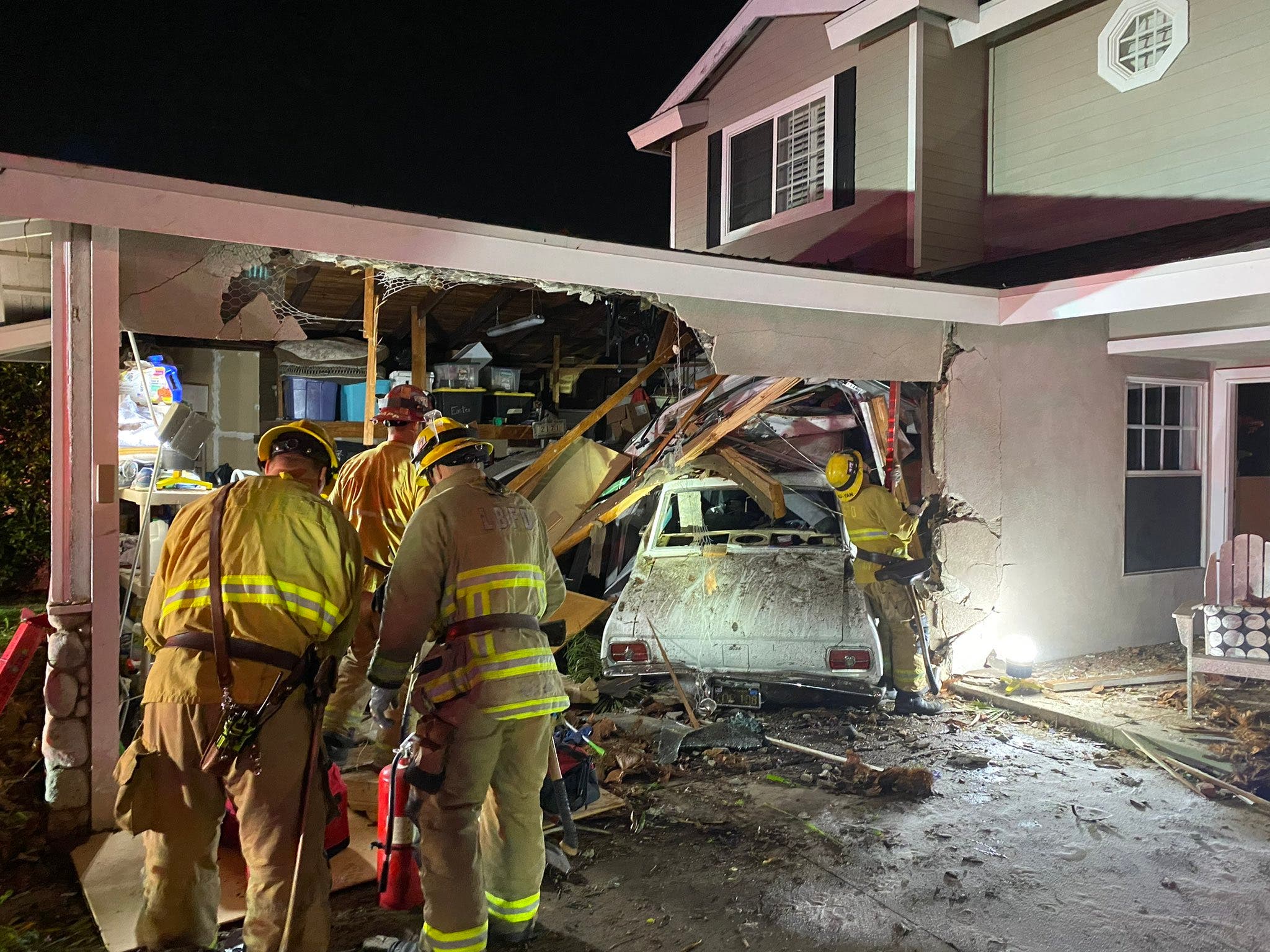 SEAL BEACH, CA —A Seal Beach family fled their home Friday night after a car rammed into their garage. The driver was temporarily trapped after causing significant damage to the roof, according to Orange County Fire Authority's technical rescue team.