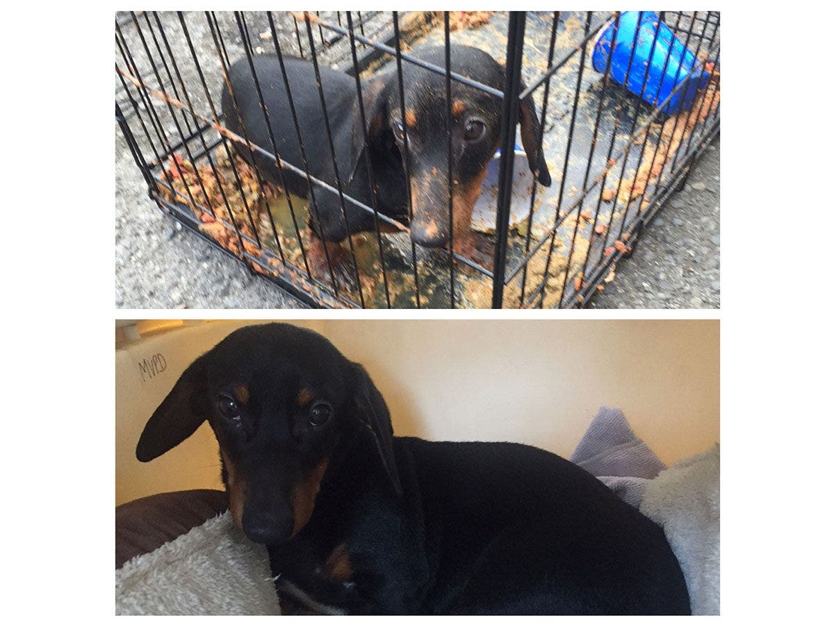 When officers arrived they found a dog inside a cage covered in his own food and droppings.