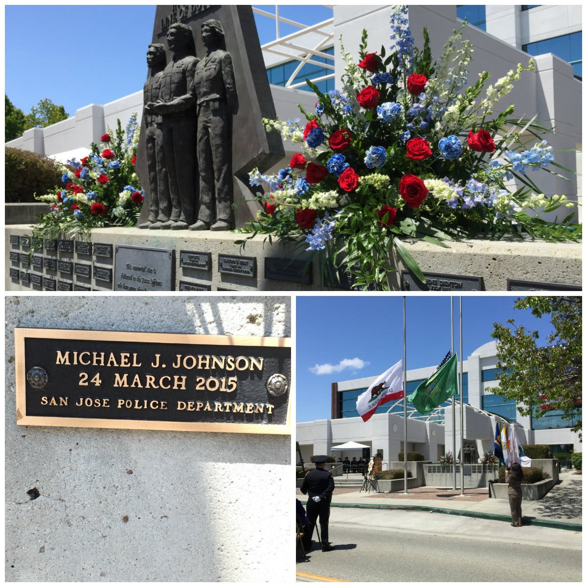A plaque for San Jose police Officer Michael Johnson was added to a memorial for fallen officers in front of the sheriff’s headquarters near West Younger and North First streets.