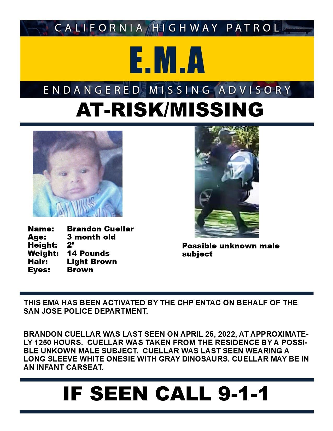 The man reportedly entered a San Jose apartment around 1 p.m. Monday and left with baby Brandon Cuellar in his carrier, according to the San Jose Police Department.