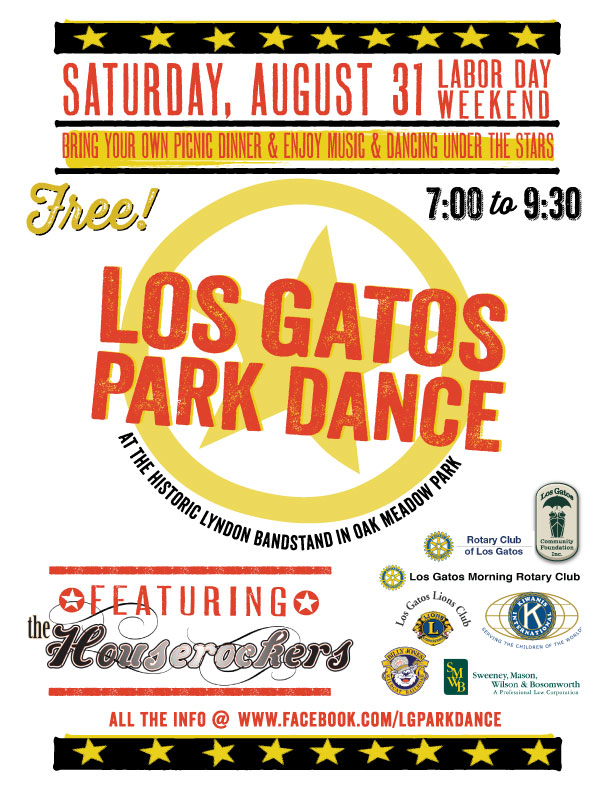 “Sharon and I both love this town and the wonderful spirit of community we live amongst. The idea of enjoying one more warm summer night dancing the night away in one of our treasured town parks seemed like a great idea for a tradition that we could start for the town. The event is free, but will make people aware of the great work that the Los Gatos Community Foundation does to fund projects for our community. Several of the service clubs in town are enthusiastically supporting the event, and the sponsorship sales to fund the costs were sold out in a few weeks. Everyone we talk to is excited about the idea of a Labor Day weekend tradition and we're looking forward to seeing celebrating the end of summer 2013 with everyone in the community,” said Kent.