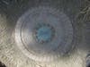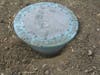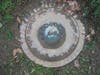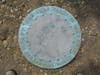 It seems to be cast cement, with a ring of metal bolt heads sticking out of it. The key to the cipher is below the skeleton, x=y. I kicked the dirt away from the edge. There is no rim, no pick hole, no notches. It doesn't sit in a frame, it is simply a disk set in the ground, and I went down only about four inches.