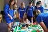 The group of young women, all wearing their bright blue San Jose State University soccer jerseys, definitely brought a dose of color to the hospital halls as they went from room-to-room in the modern pediatrics unit.