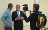 Steve Napolitano is interviewing Russ Lesser with Brad Jacobson filming. Napolitano has been interviewing candidates and residents all night.