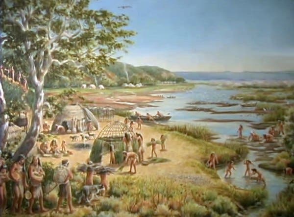 Above: A painting by Mary Leighton Thomas, named "Wiyot’s Children", suggests the appearance of the indigenous people's village known by archaeologists as LAN-62.