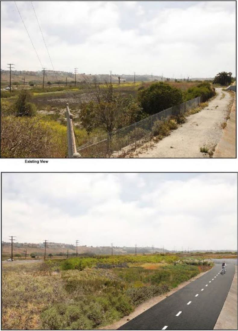 Above: The southern bank of Ballona Creek will be replaced by an earthen levee supporting a new bike path and separate parallel footpaths.