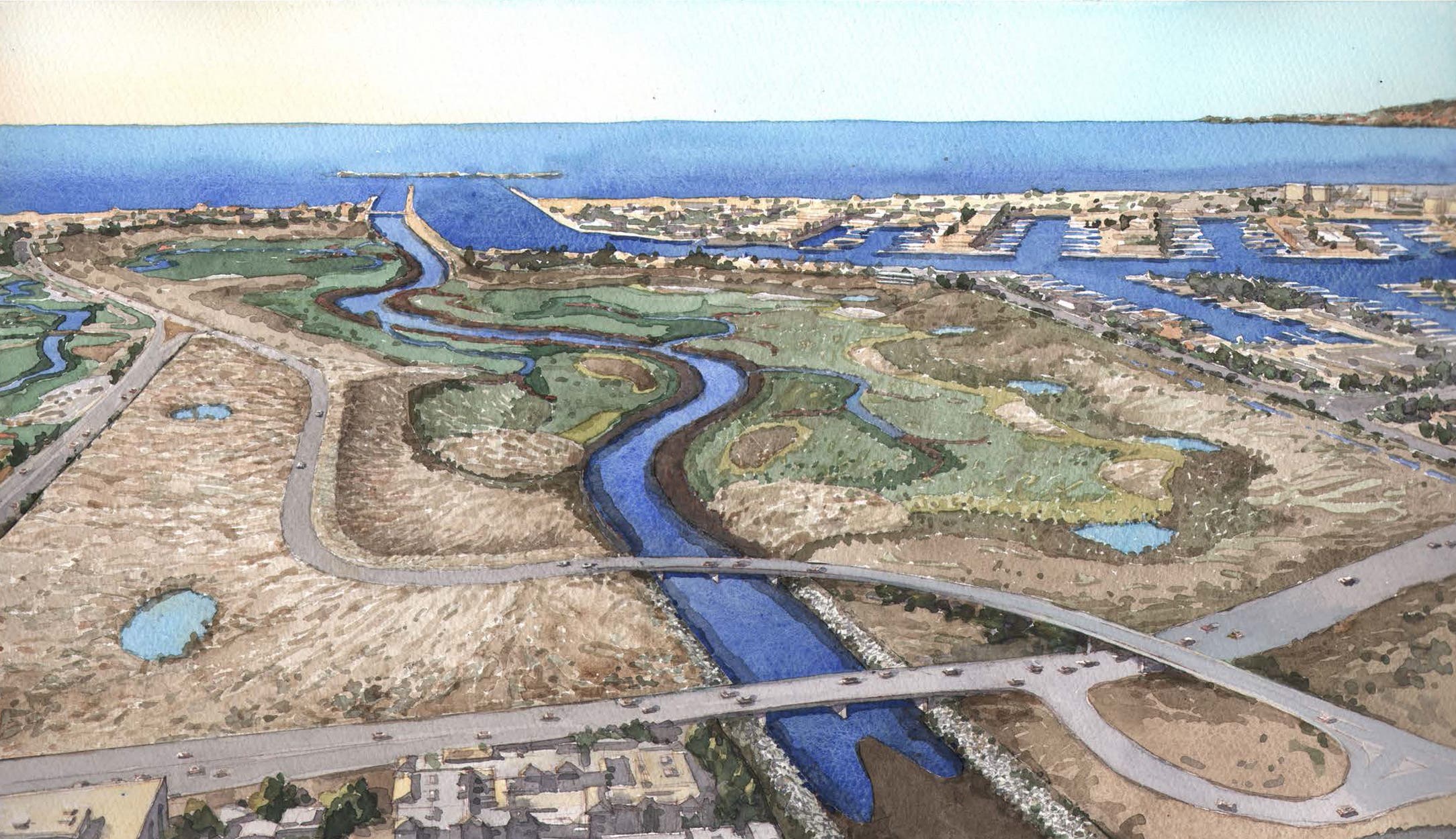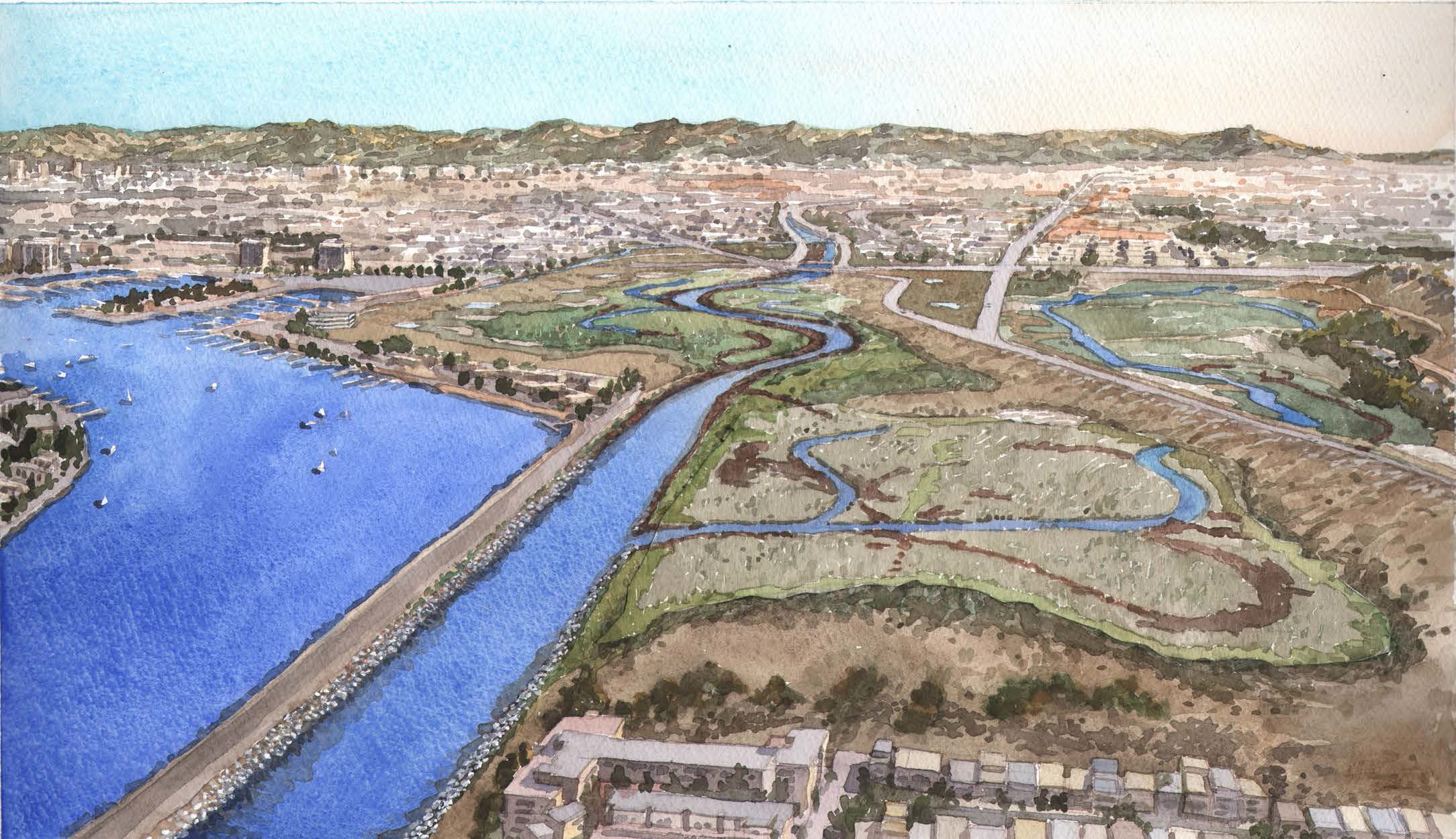 Above: Rendering of the northern half of the proposed restoration project at completion. Below: Rendering of the southern half of the proposed restoration project at completion (The Bay Foundation)