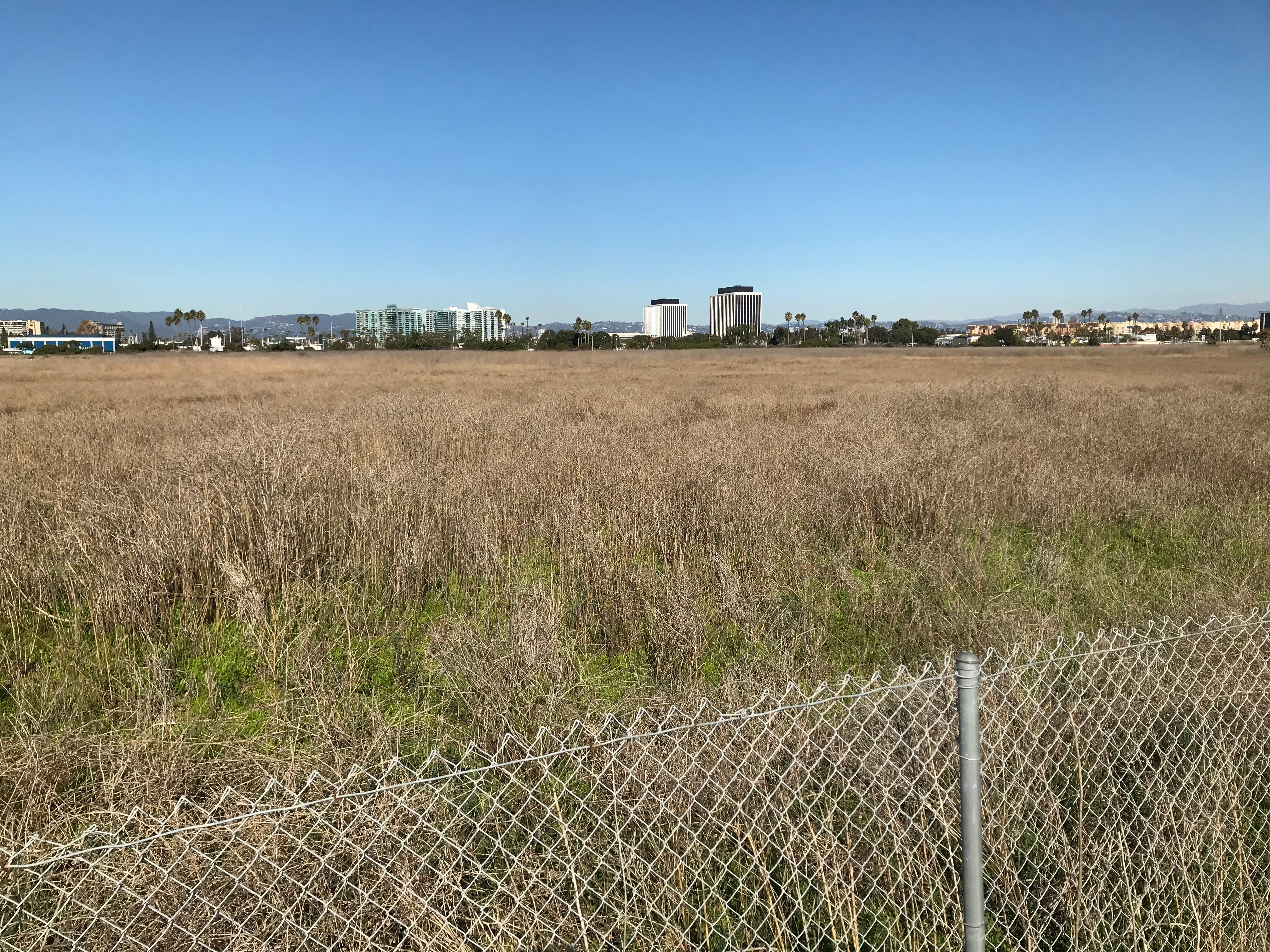 Above: This dry, weedy expanse of vacant land south of Fiji Way, once tidal wetlands, was where Marina construction dumped 3 million yards of dredge spoils. Hughes' Summa Corporation planned to develop the land, but eventually sold it to California.