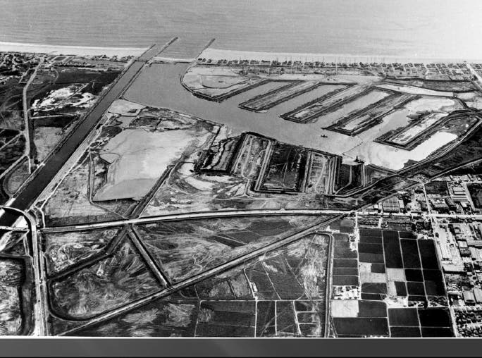 Above: Marina Del Rey construction in the 1950s buried the northern half of Ballona's saltmarsh with dredged muds, shown in the photo center-left. The Fish and Wildlife project will dig out this fill to recreate wetlands and reuse it for levee, trail and upland habitat construction.