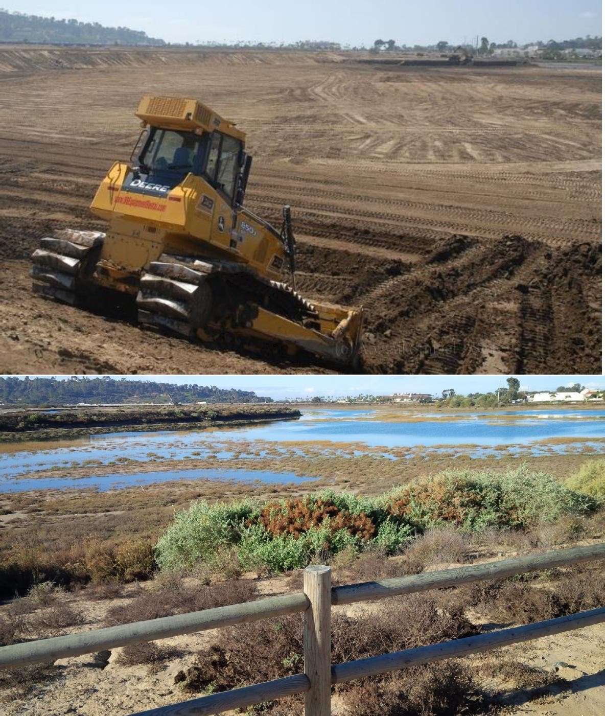 Above: Before and After photos of the San Dieguito Wetlands Restoration, near Del Mar. The Ballona splinter groups peddle fear of excavation and grading, concealing from the public the successful end results. Over 200 California coastal wetland restorations, including the Ballona Freshwater Marsh, have employed these methods. Ballona will be among the last.