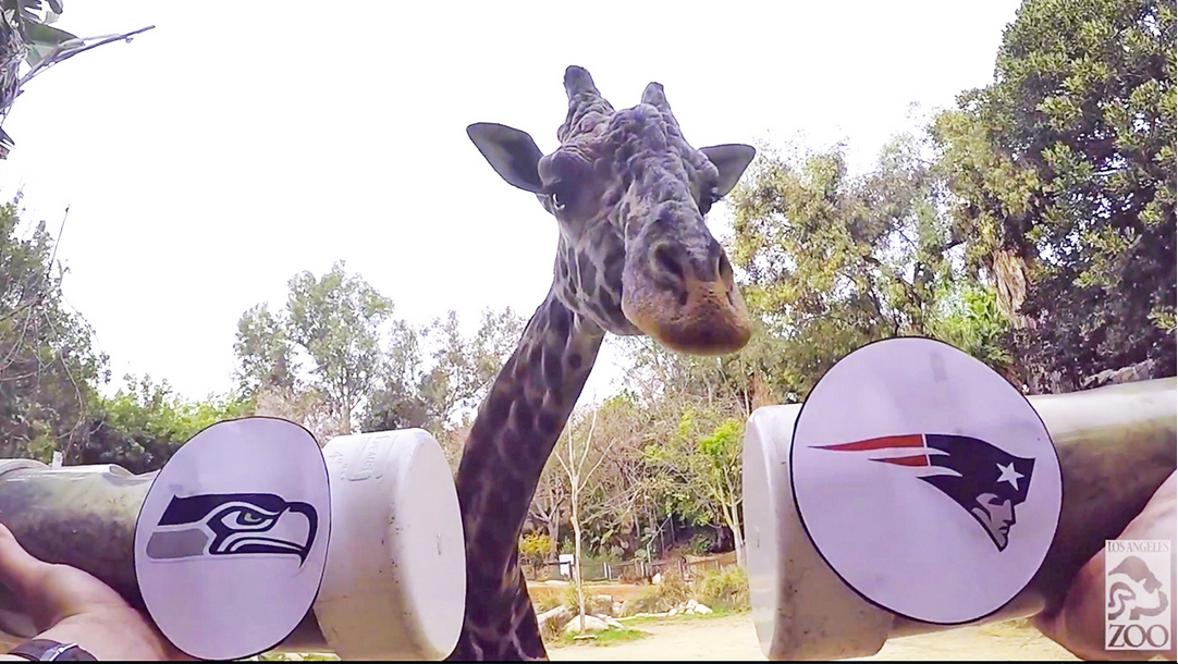 Check out which team is predicted to win Super Bowl 49 by Masai giraffe Artimis, the Los Angeles Zoo’s resident football expert.