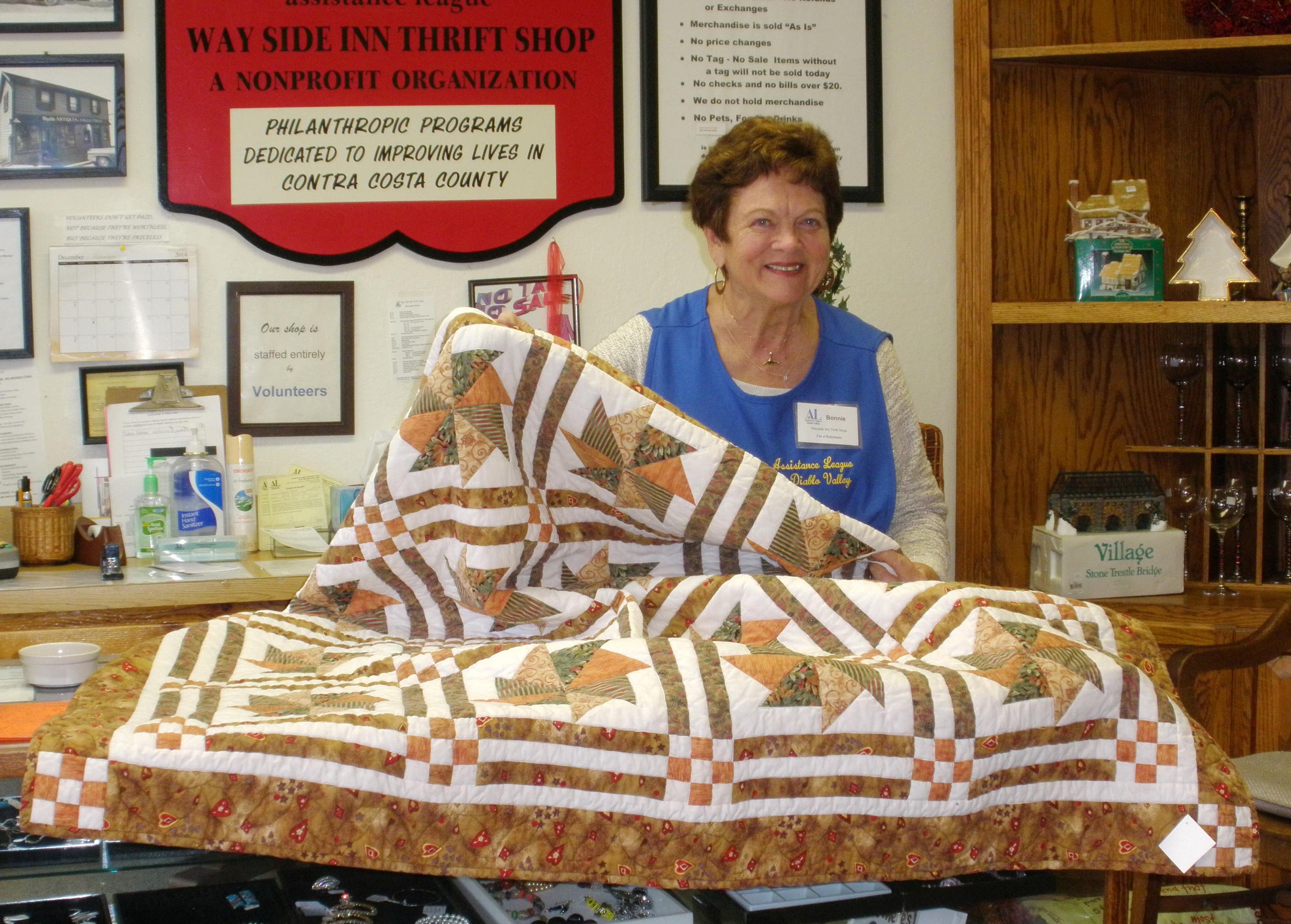 Assistance League® of Diablo Valley is a nonprofit, member volunteer organization dedicated to improving lives in our community through hands-on programs. Throughout the year, member volunteers at Assistance League® Way Side Inn Thrift Shop, located at 3521 Golden Gate Way, in Lafayette, have been collecting and storing quilts and related items in preparation for the Quilt event scheduled for Tuesday, January 20.