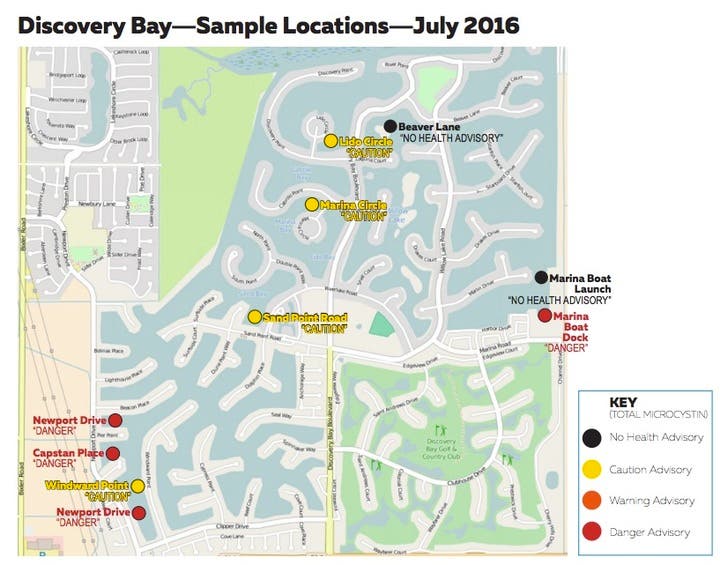 “We received multiple complaints from Discovery Bay, and we sampled those areas for blue-green algae. Test results indicate the presence of toxin and we’re asking the community to stay out of the water until further notice,” said Marilyn Underwood, director of CCHSEH.