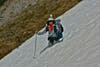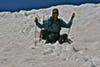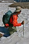In spite of the snow, our daily mileages remained at twenty and above and the spirit of the group remained positive. Wyoming had the least experience with snow, but learned quickly even though it scared her. Blister always took the high route, nearly skiing over the long traverses until being stopped dead in his tracks by a sudden sinking feeling as he plunged deep into the soggy mess. Eric was more thoughtful and studied every option before committing himself to a course, and often glissaded down slope and hiked snow free up a valley. Brooks found his course somewhere in between and plunged his own steps if need be. That gave several options to us three slower folk, and I just bless the character of those guys that they didn’t just hike on and leave us to our slower pace and our own devices.