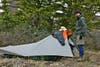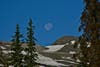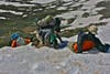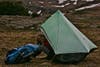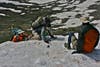 That first night we found ourselves on a very exposed saddle at 12,000 feet, looking at a long climb first thing the next morning and plenty of snowy trail on top. We found a few stunted trees and a boulder for wind breaks and set up camp on the lee side of the hill.