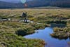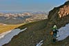 On our third night we camped low, next to a great soggy meadow, and Nancy found her wet shoes frozen so solidly the next morning she couldn’t get them on. She and Eric had to put one each under their jackets for a time to warm them enough to break the ice. We climbed out of that lowland, back up thousands of feet to the rolling ridges and snowy slopes of the Divide.