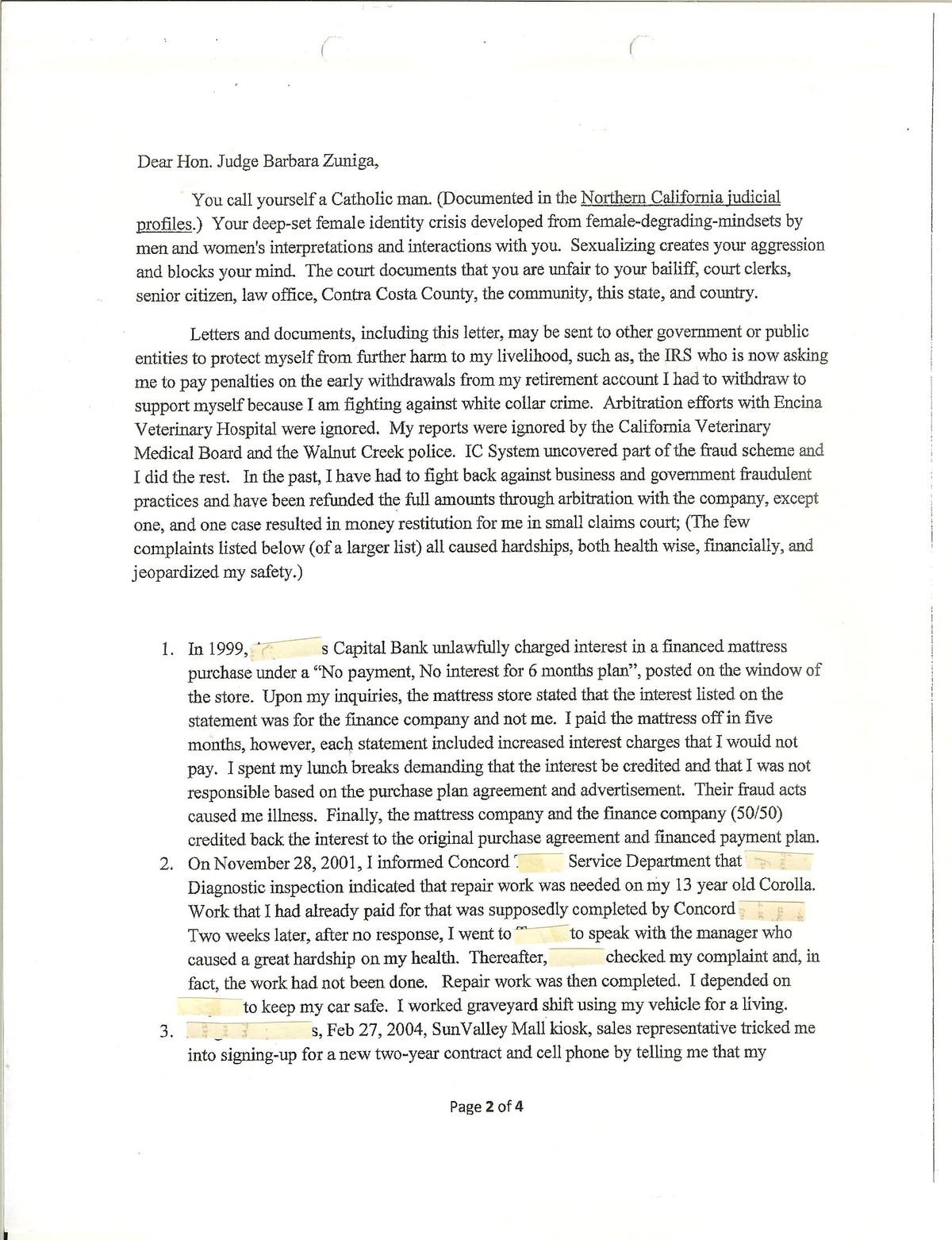 The letter I wrote to Judge Barbara Zuniga is not a threat. Legally, a threat MUST be DIRECT. Pages 2 and 3 of my 4 page letter, are directed to J. Barbara Zuniga. The Contra Costa County DA, the "Bad Blood" attorney Jane Elliot, and the two Sheriff Deputies who came to my home in Concord, omitted pages 2 and 3. Supposedly, the two deputies were recording the psychological and physical terror they had carried out, ordered by their superiors. The 4 page letter I wrote was my reaction of shock, horror, anger, and disgust of the California 1st District Court of Appeal, Division One, decision by Presiding Justice James Marchiano, Justice Dondero, and Justice Banke, because their written words didn't make any sense whatsoever and NEVER addressed any of the issues in my case, Mink v Encina Veterinary Clinic, Inc. et al. (Redacted copy of pages 2 and 3 of my direct written words to Judge Barbara Zuniga below):